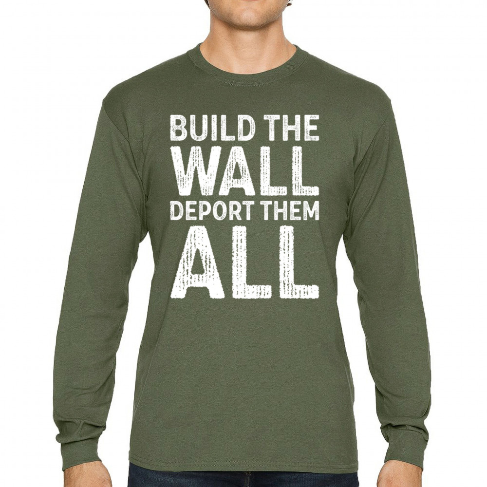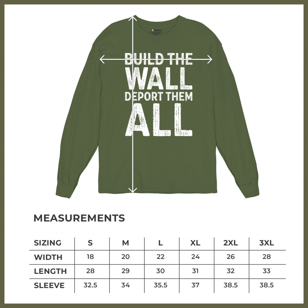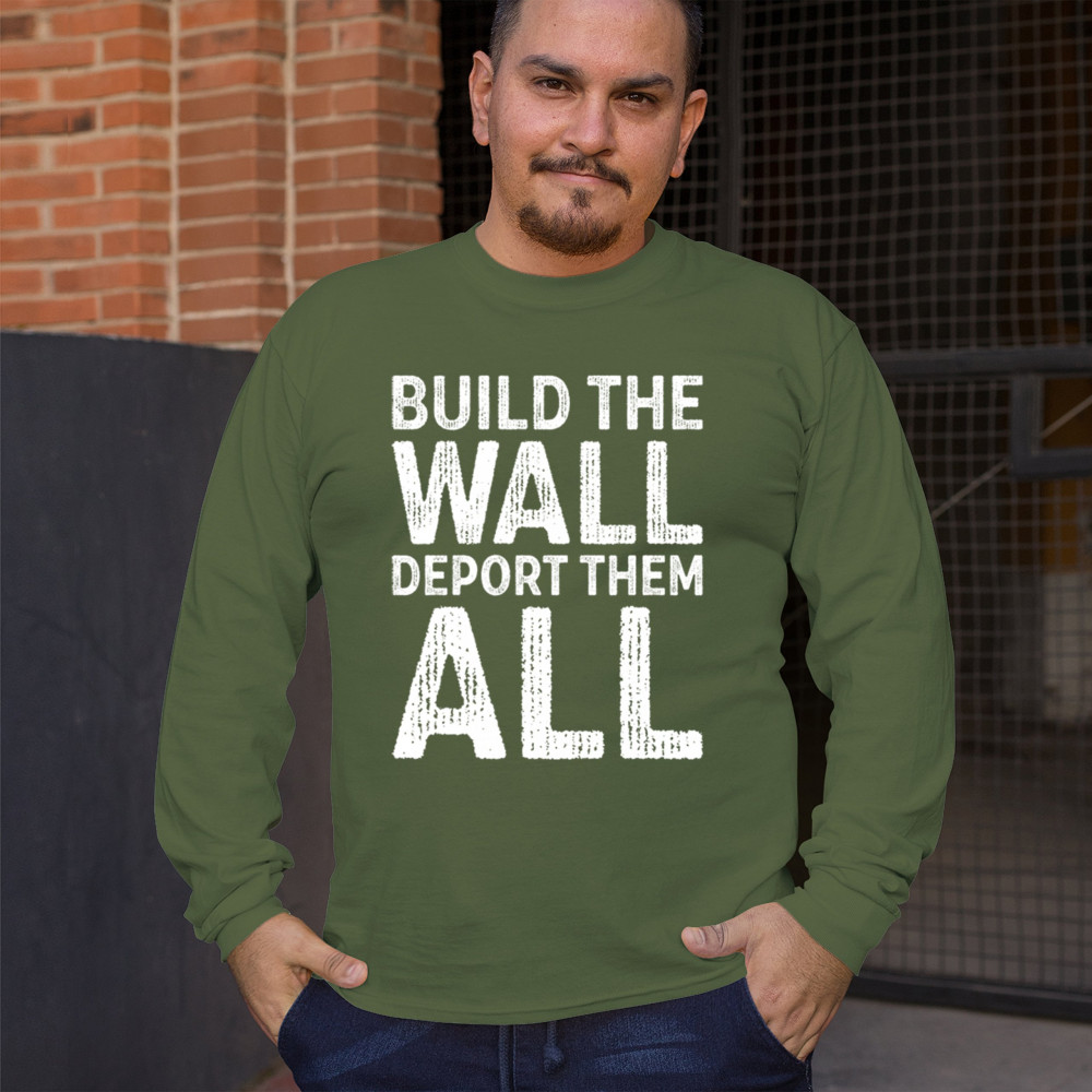 Stand strong for border security with our 'Build the Wall Deport Them All Trump 2024' tee. As a proud Trump supporter, join the America First movement and champion conservative values. Trust in God, not government, and reject the failed policies of Sleepy Joe. Let's go Brandon! Let the American flag wave high as we rally for victory in 2024.