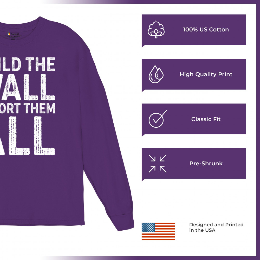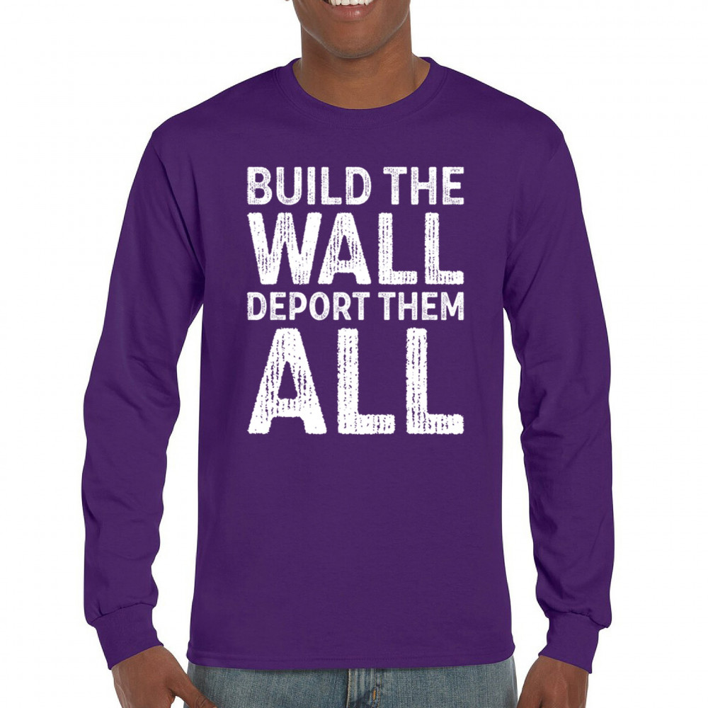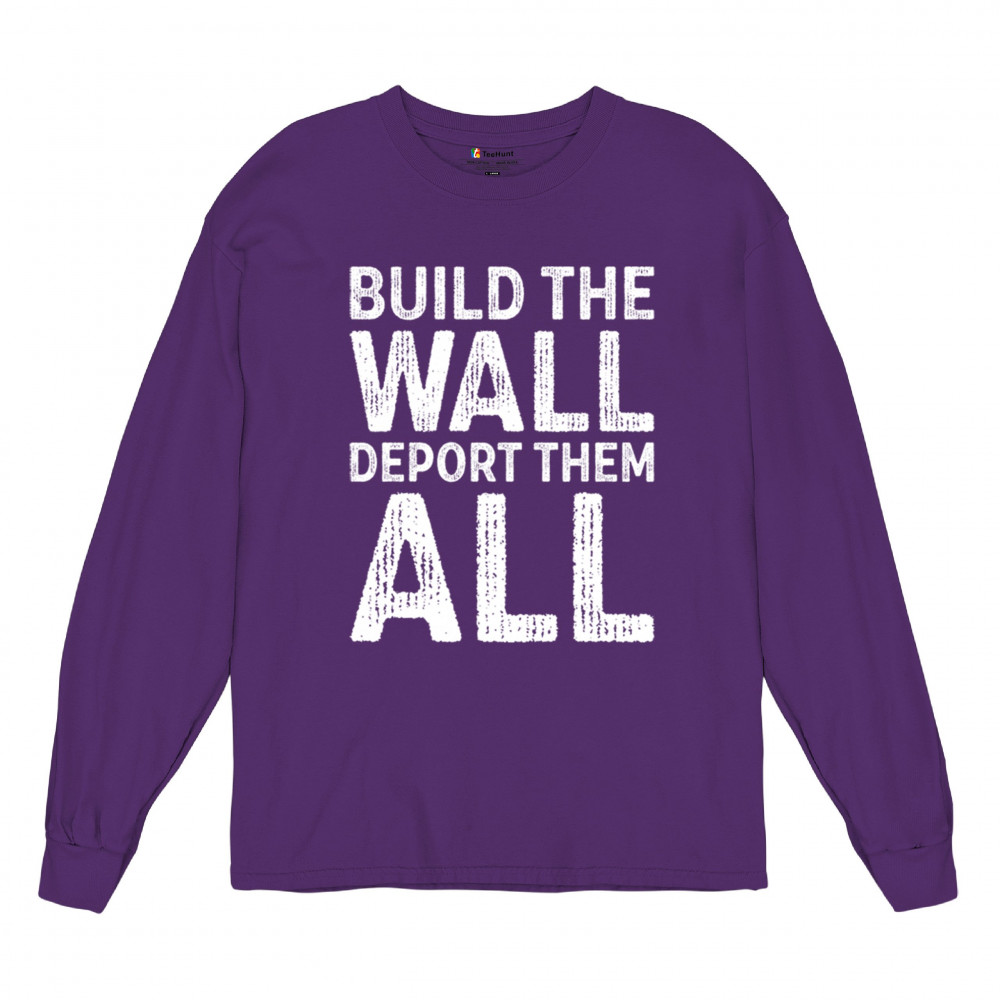 Stand strong for border security with our 'Build the Wall Deport Them All Trump 2024' tee. As a proud Trump supporter, join the America First movement and champion conservative values. Trust in God, not government, and reject the failed policies of Sleepy Joe. Let's go Brandon! Let the American flag wave high as we rally for victory in 2024.