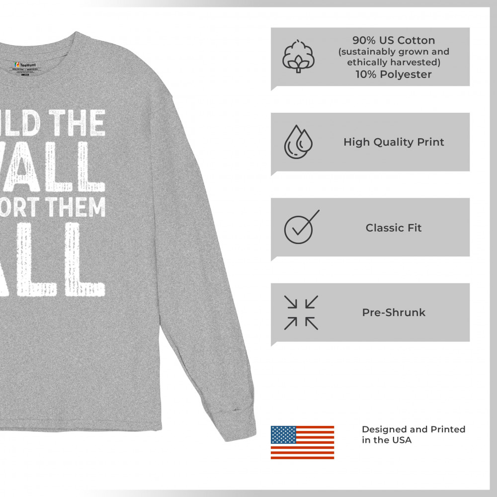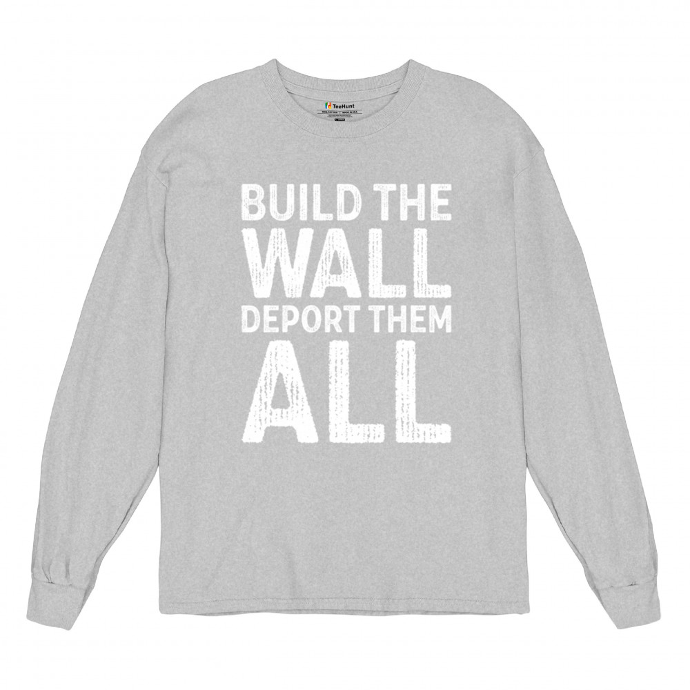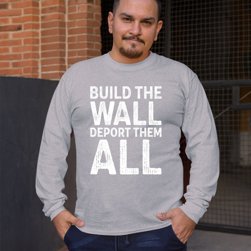 Stand strong for border security with our 'Build the Wall Deport Them All Trump 2024' tee. As a proud Trump supporter, join the America First movement and champion conservative values. Trust in God, not government, and reject the failed policies of Sleepy Joe. Let's go Brandon! Let the American flag wave high as we rally for victory in 2024.