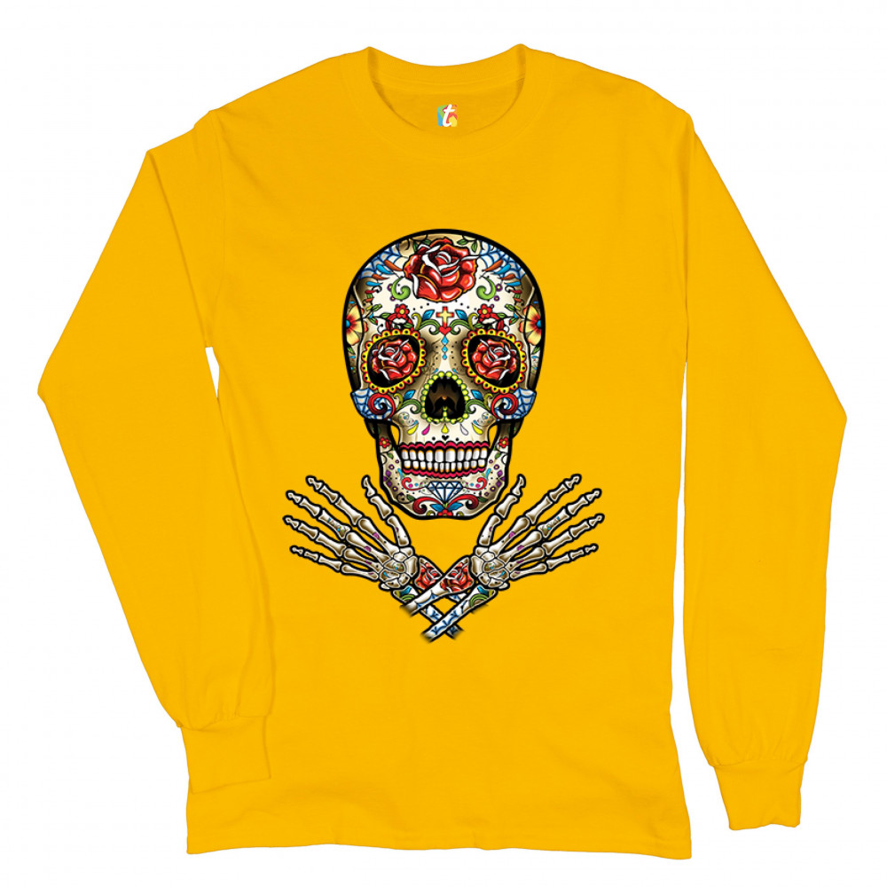 A huge print featuring a big calavera with roses in the eye sockets. There is a cross between the eyes and a huge rose on the forehead. Below the skull there are crossed arms. A great choice for anyone who upholds the traditions and celebrates the Day of