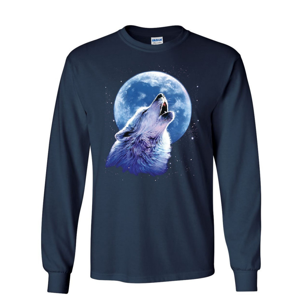 CALL OF THE WILD long sleeve t-shirt lone wolf howling at the moon wildlife tee navy blue