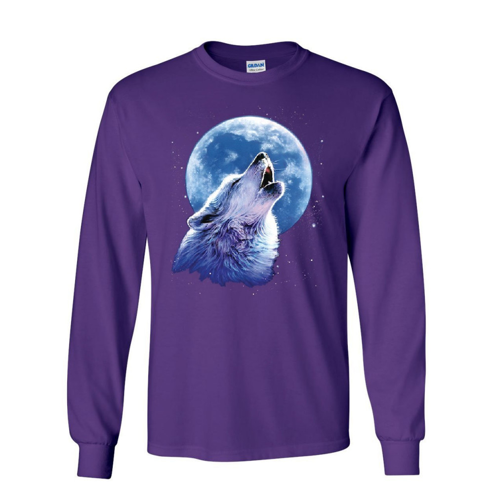 CALL OF THE WILD long sleeve t-shirt lone wolf howling at the moon wildlife tee purple