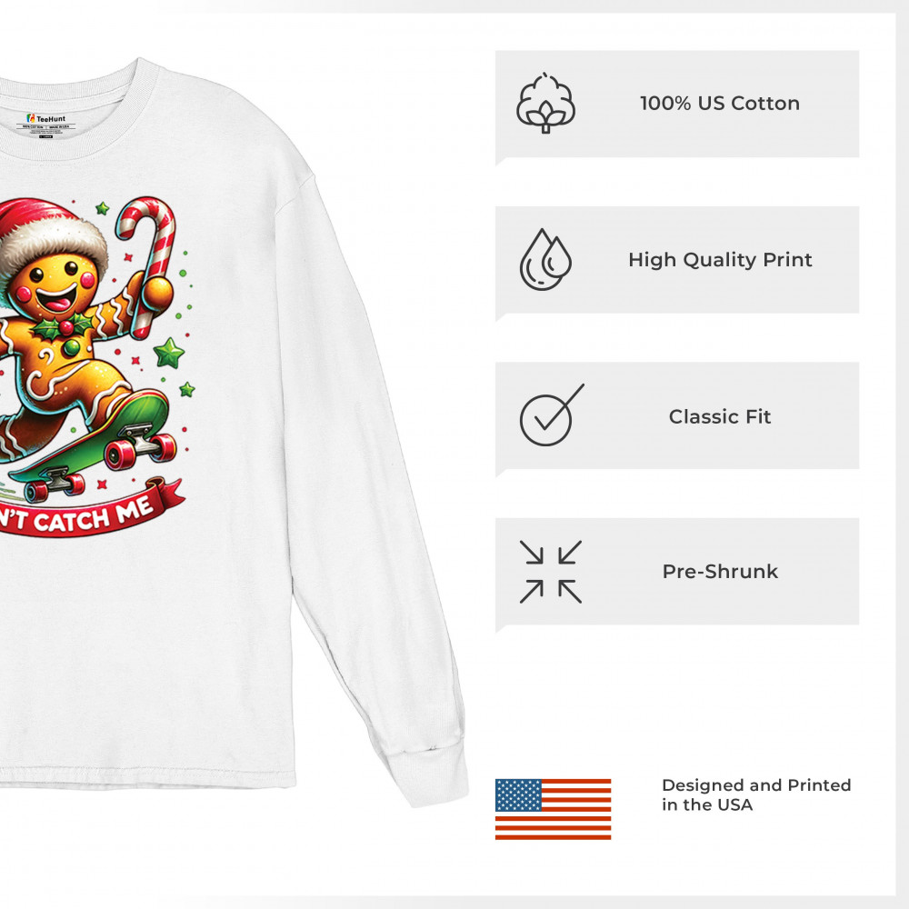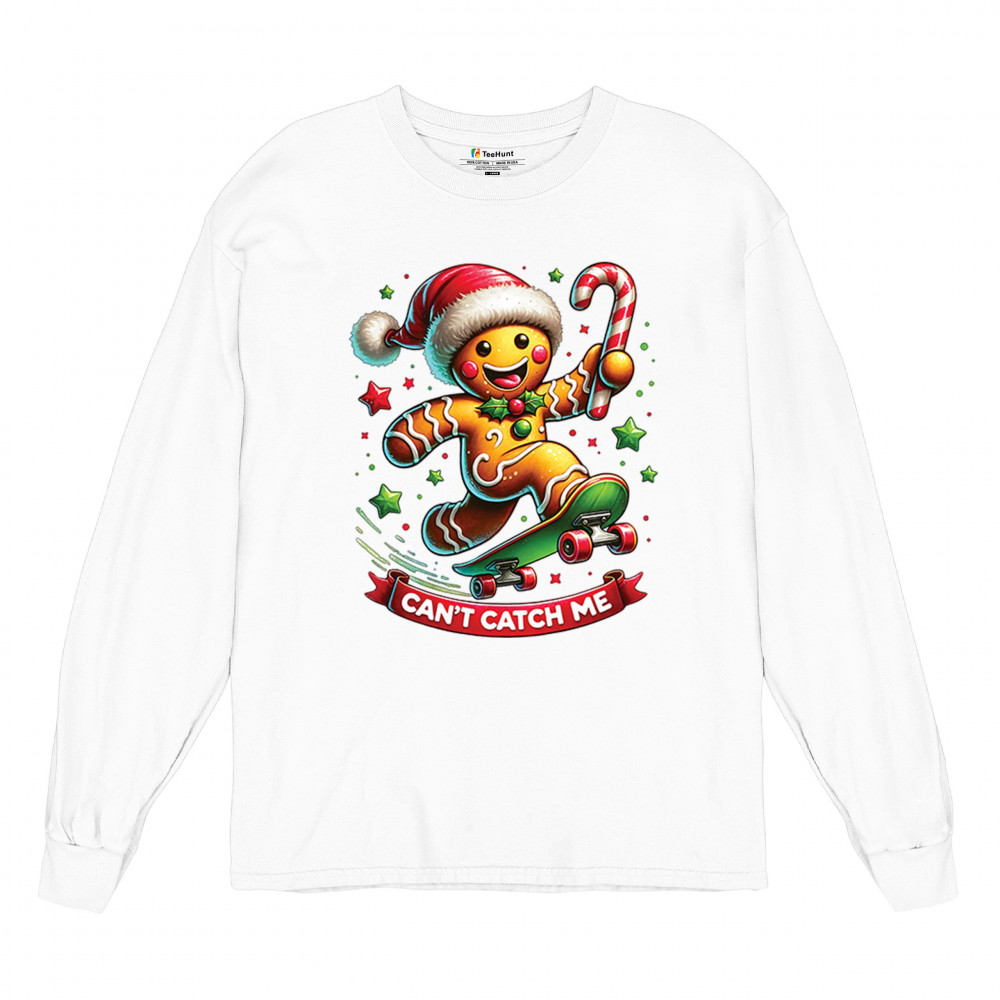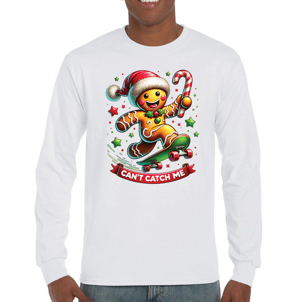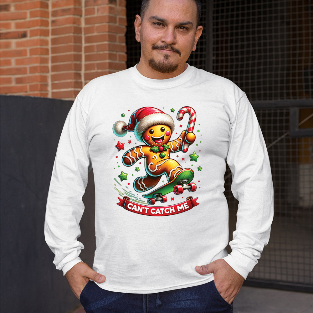 A fun Christmas design featuring a gingerbread character on a skateboard, candy cane in hand, and bright festive colors. Perfect for holiday party outfits, family gatherings, Christmas photos, festive humor fans, stocking stuffer gifting, winter celebrations, and anyone who loves playful seasonal graphics with cheerful personality.