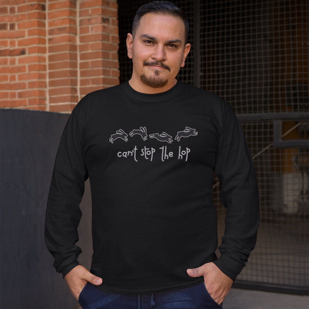 CAN'T STOP THE HOP long sleeve t-shirt happy easter funny hopping rabbits black