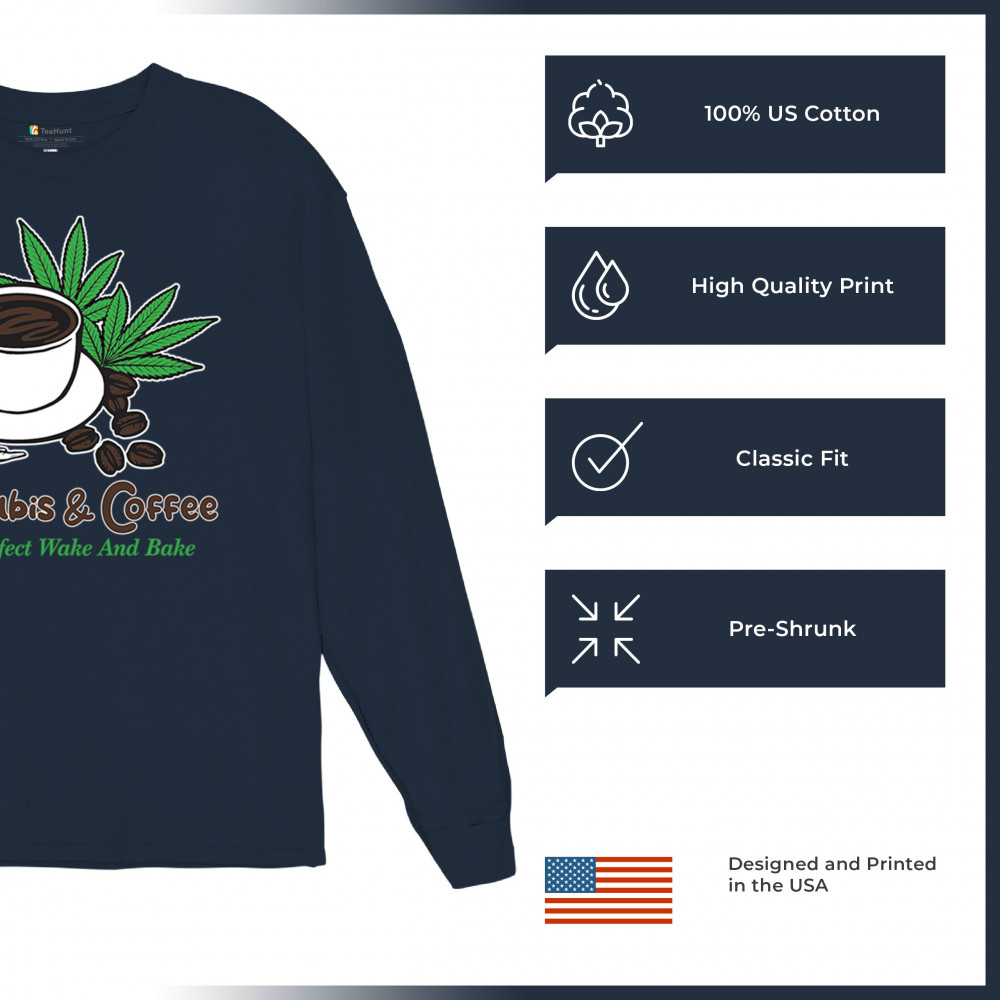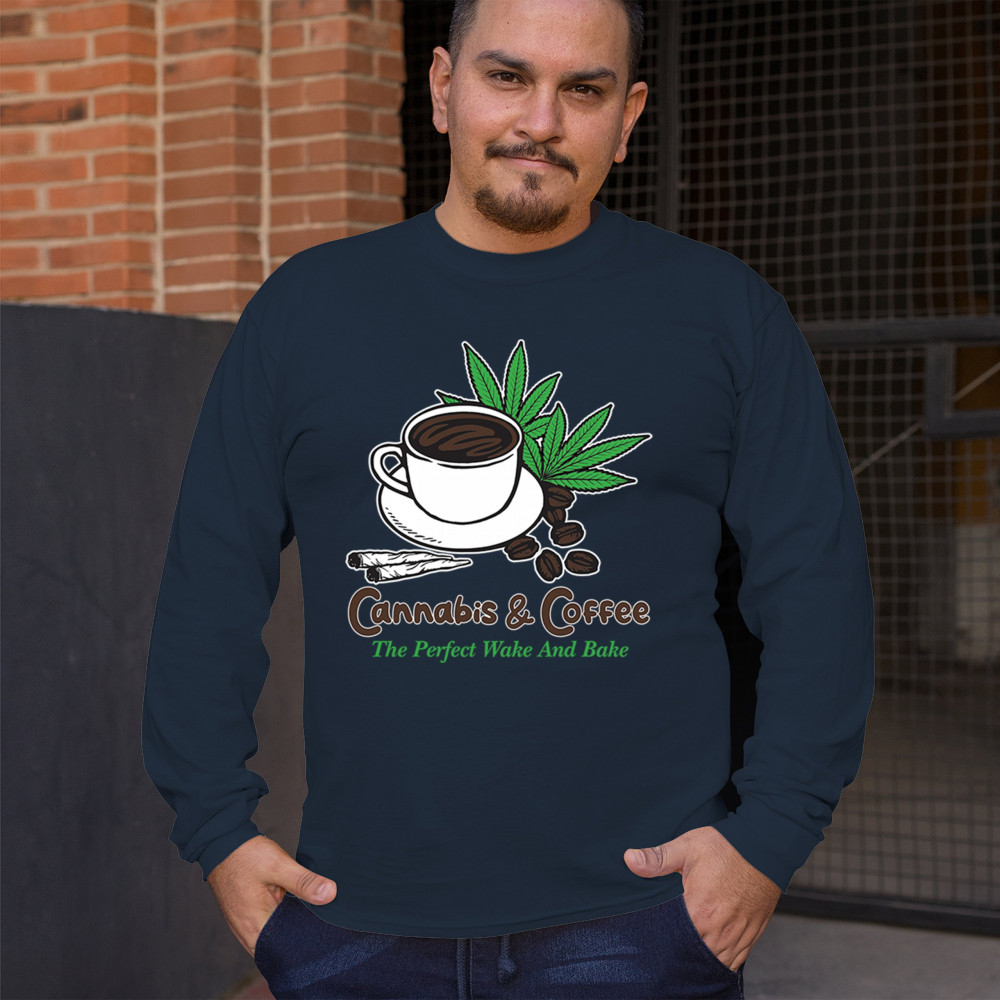 A chill cannabis and coffee design with cup, joints, and beans. Great for wake-and-bake fans, mellow mornings, and herb-fueled coffee lovers.