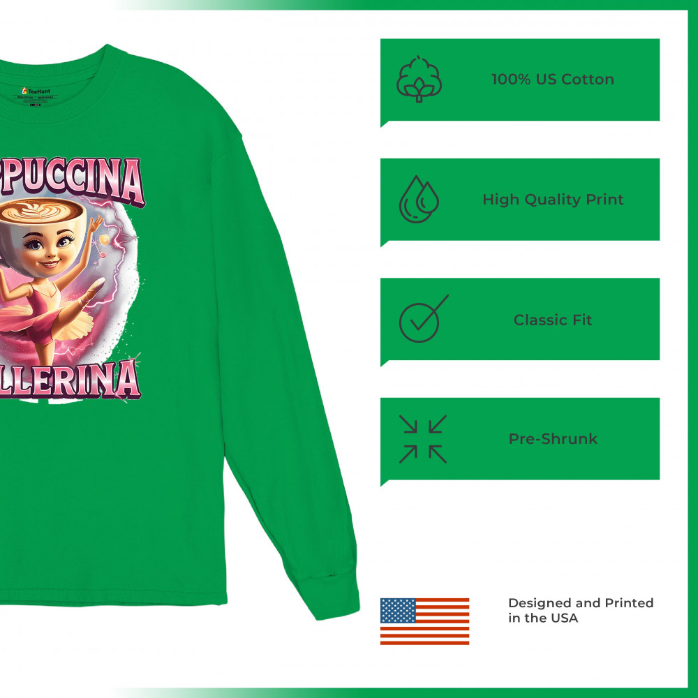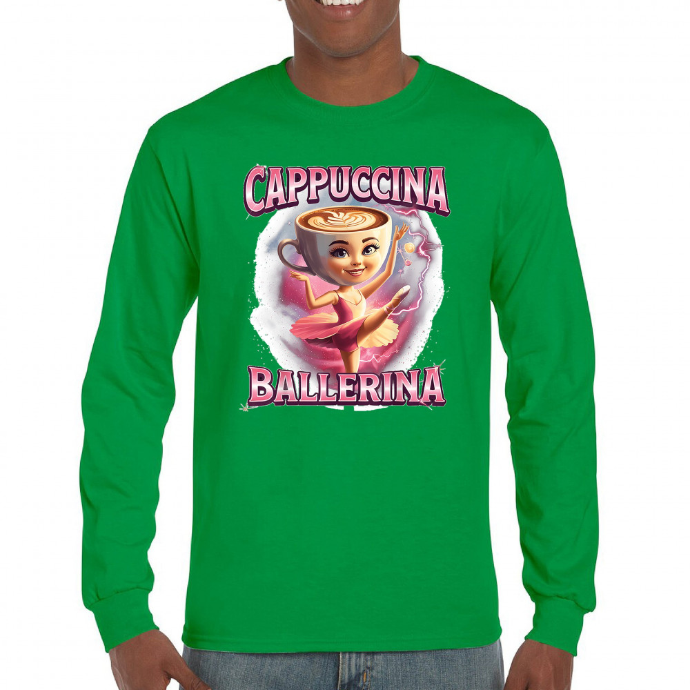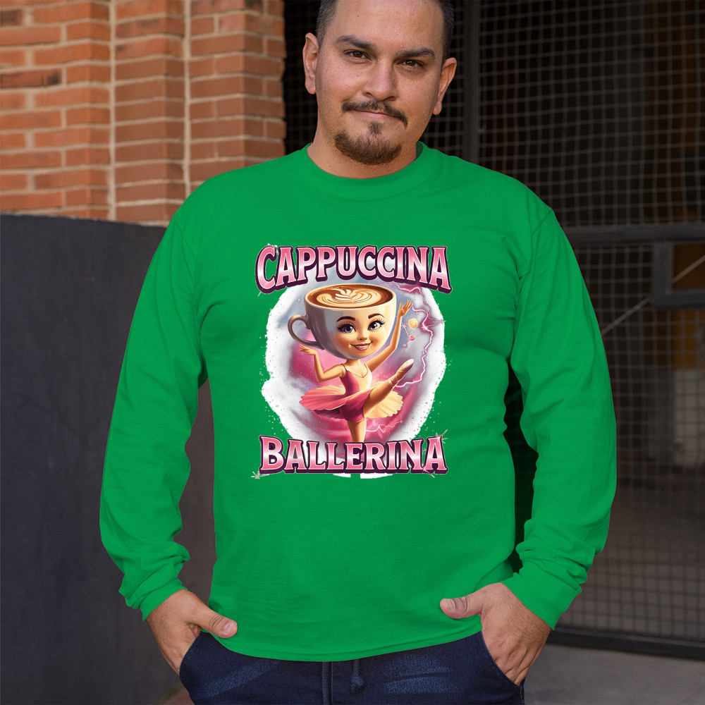 Cappuccina Ballerina is your perfect mix of meme chaos and coffee-core fashion. This absurd design features a ballet-dancing cappuccino head with weirdcore flair and Gen Z humor. A surreal blend of ironic internet fashion, TikTok trends, and espresso madness—ideal for meme lovers, caffeine addicts, and viral absurdists alike.