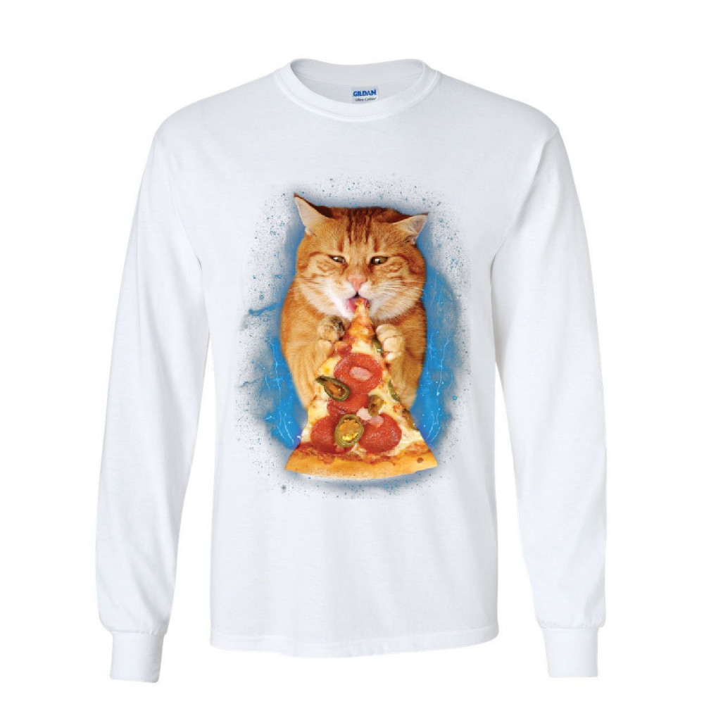 CAT EATING PIZZA long sleeve t-shirt funny weird kitten pet kitty peperoni tee white