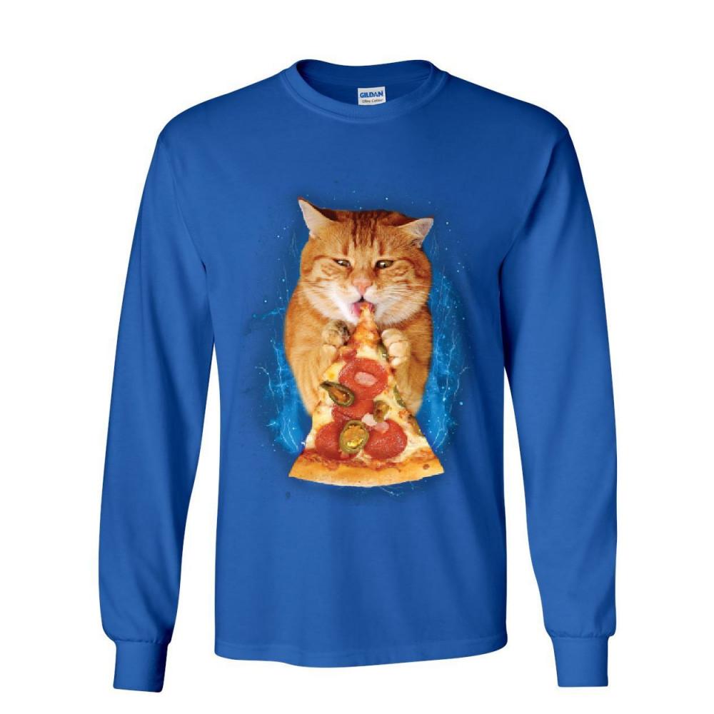 CAT EATING PIZZA long sleeve t-shirt funny weird kitten pet kitty peperoni tee royal blue