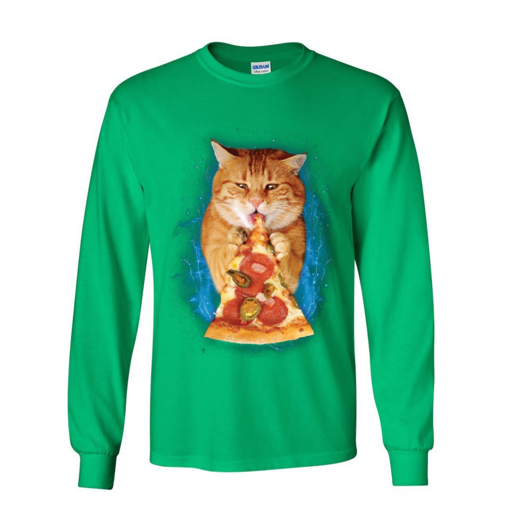 CAT EATING PIZZA long sleeve t-shirt funny weird kitten pet kitty peperoni tee green