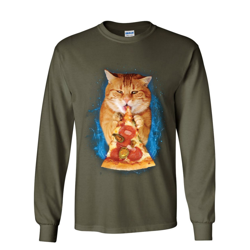 CAT EATING PIZZA long sleeve t-shirt funny weird kitten pet kitty peperoni tee military green