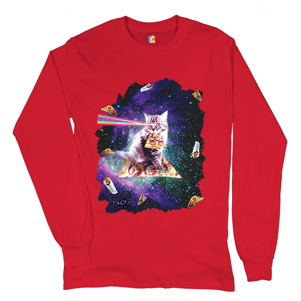 A print featuring a cat flying through space on a slice of pizza holding another slice in it's mouth while firing rainbow lasers from it's eyes. The cat is surrounded by burritos and shawarmas. A great choice for anyone who is into cats, space and weird s