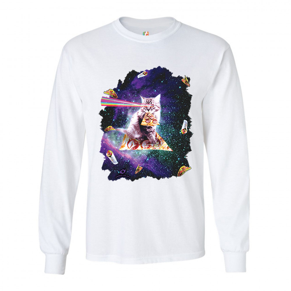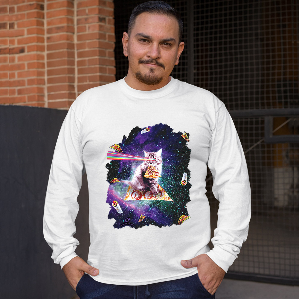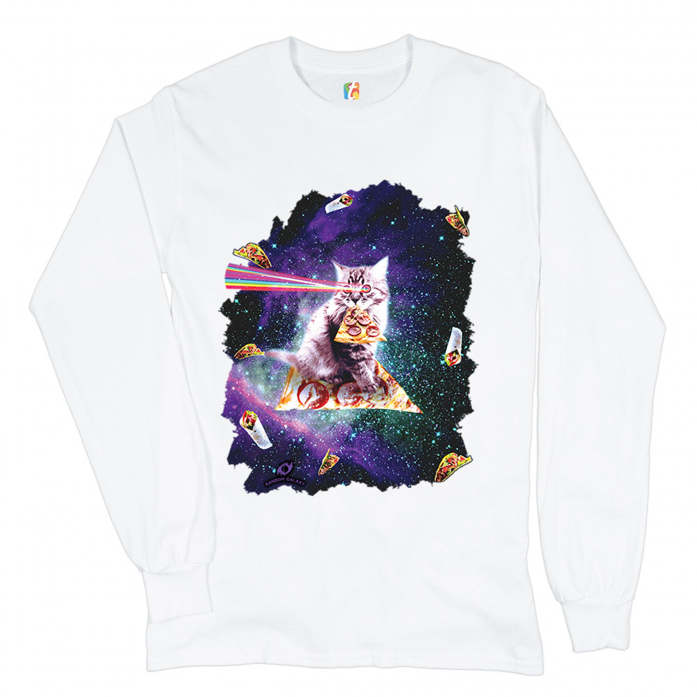 A print featuring a cat flying through space on a slice of pizza holding another slice in it's mouth while firing rainbow lasers from it's eyes. The cat is surrounded by burritos and shawarmas. A great choice for anyone who is into cats, space and weird s