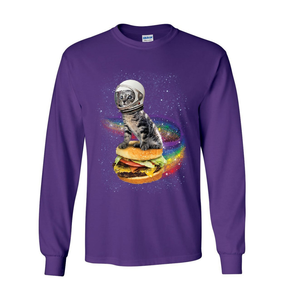 CAT FLYING A RAINBOW BURGER long sleeve t-shirt funny astronaut kitten space tee purple