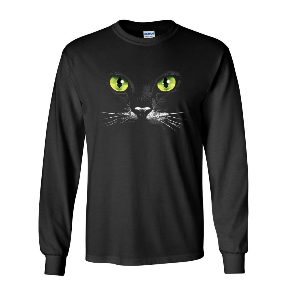CAT GREEN EYES long sleeve t-shirt animal pet lovers kitten huge cat face tee black