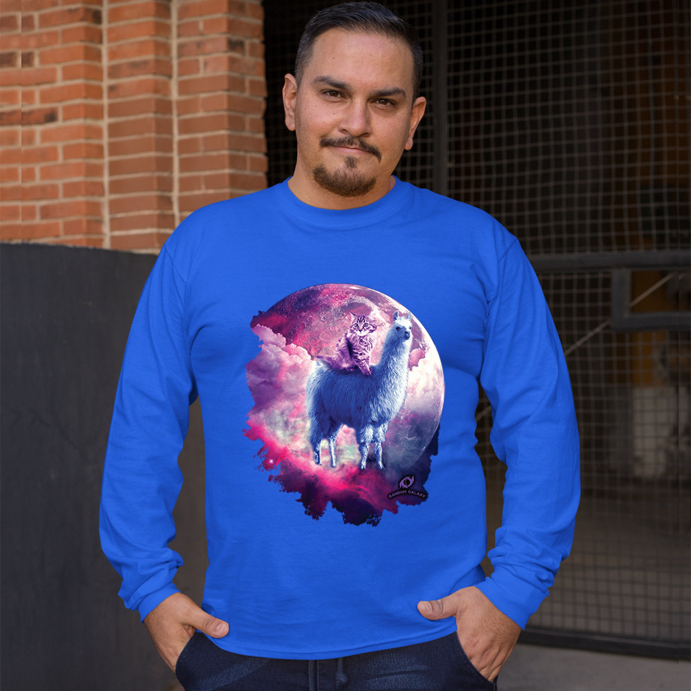 CAT RIDING A LLAMA IN SPACE long sleeve t-shirt weird galaxy moon creative royal blue