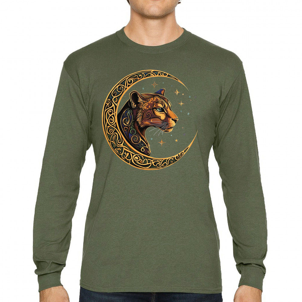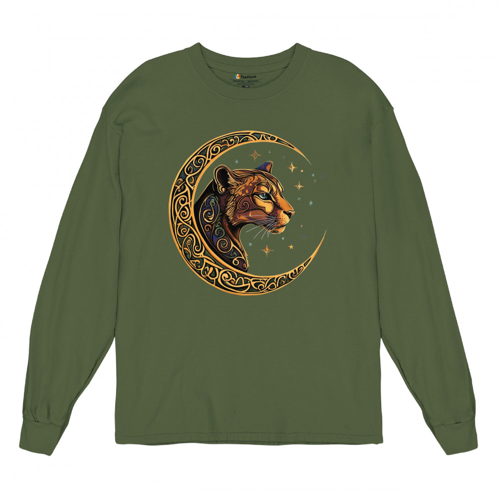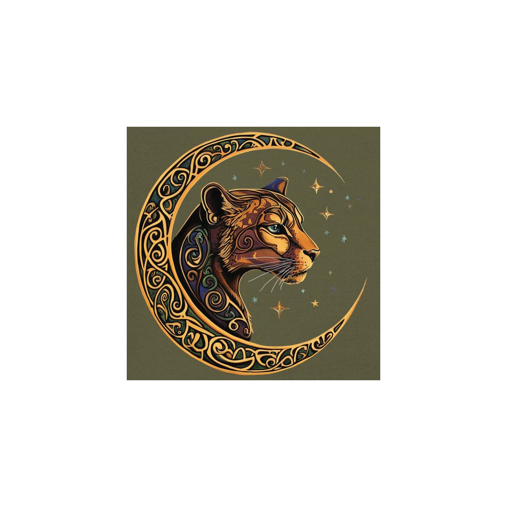 Mystical and elegant, this celestial leopard design merges wild animal strength with spiritual energy. Framed by a golden Celtic crescent moon and set against a starlit sky, it captures themes of nature, intuition, tribal symbolism, fantasy, and feminine power. Ideal for astrology fans, animal lovers, and seekers of cosmic connection.