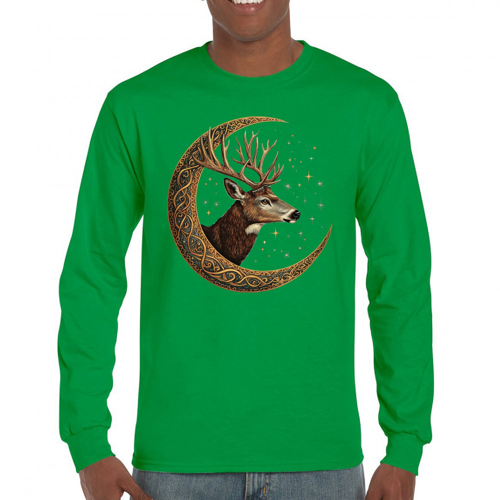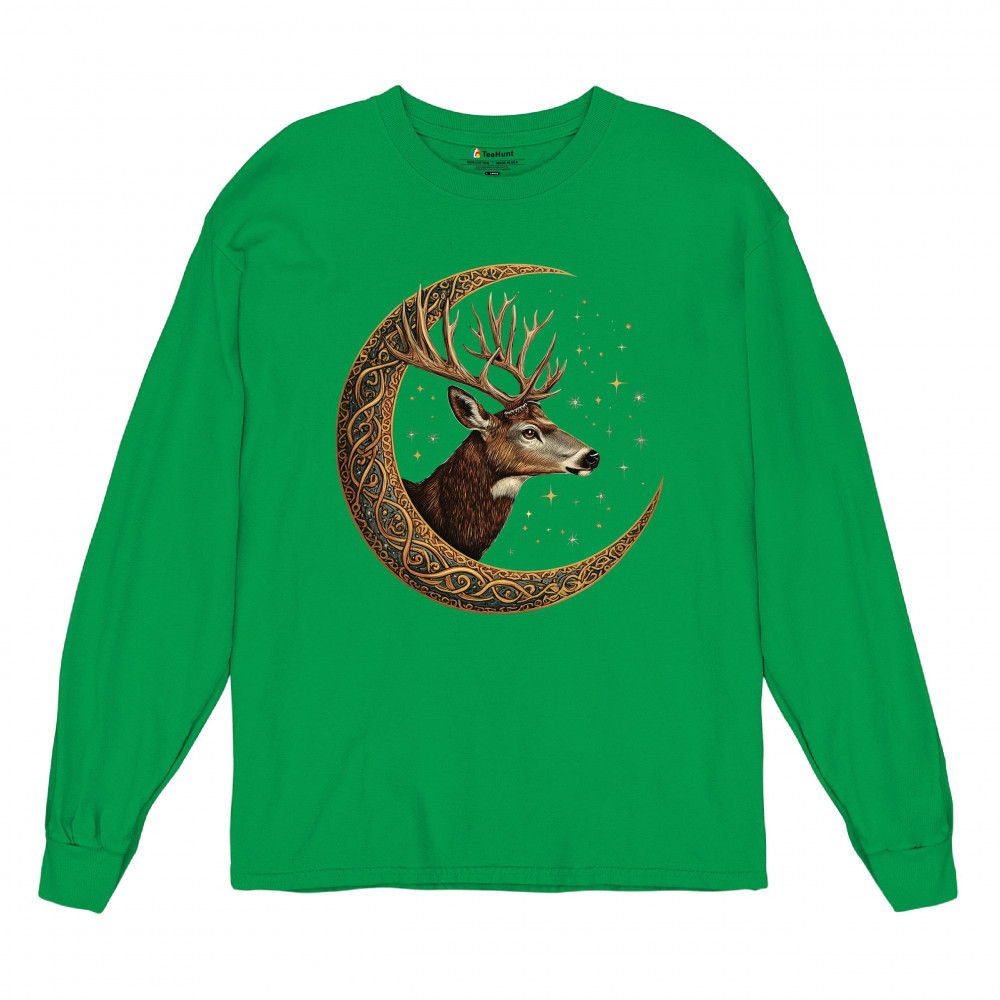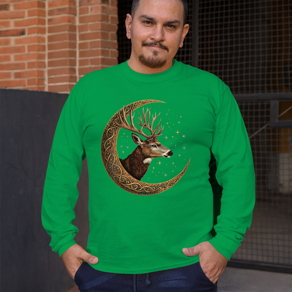 Majestic deer in Celtic moon with stars—symbol of protection, nature, and cosmic wisdom. A mystical gift for hunters, druids, and forest lovers.