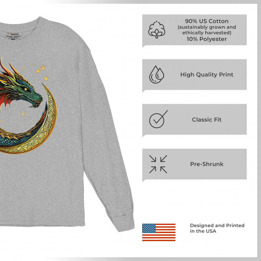 Fierce dragon in Celtic crescent moon with glowing eyes and starry sky. Perfect for fantasy fans, gamers, and spiritual warriors seeking mythic art.