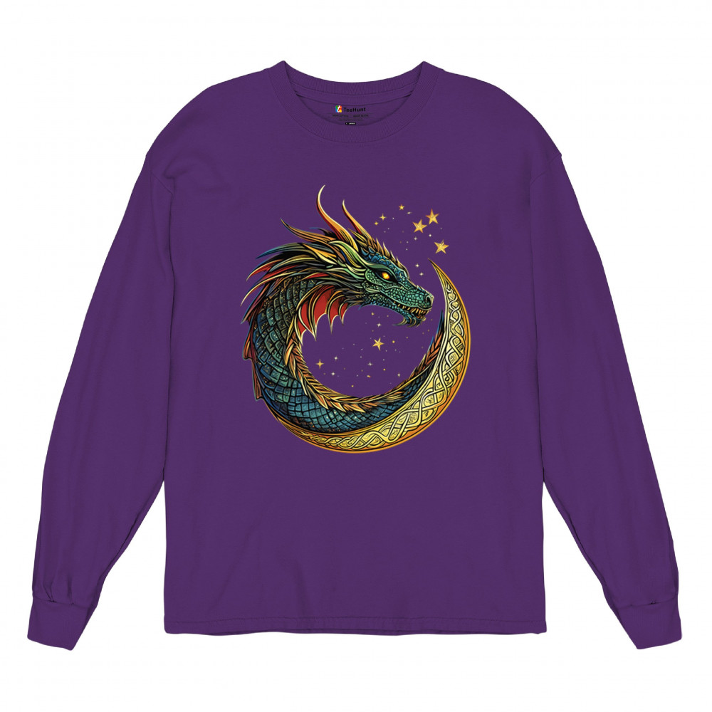 Fierce dragon in Celtic crescent moon with glowing eyes and starry sky. Perfect for fantasy fans, gamers, and spiritual warriors seeking mythic art.