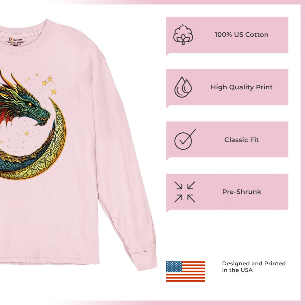 Fierce dragon in Celtic crescent moon with glowing eyes and starry sky. Perfect for fantasy fans, gamers, and spiritual warriors seeking mythic art.