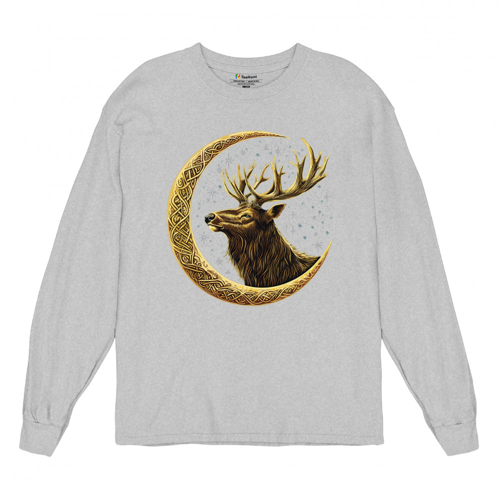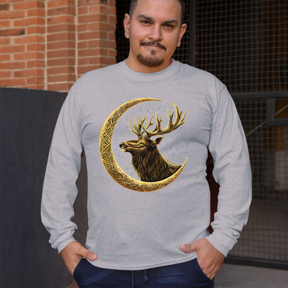 Celtic stag design with golden moon and cosmic stars. Symbolizes forest strength, leadership, and spiritual energy. Perfect for nature lovers.