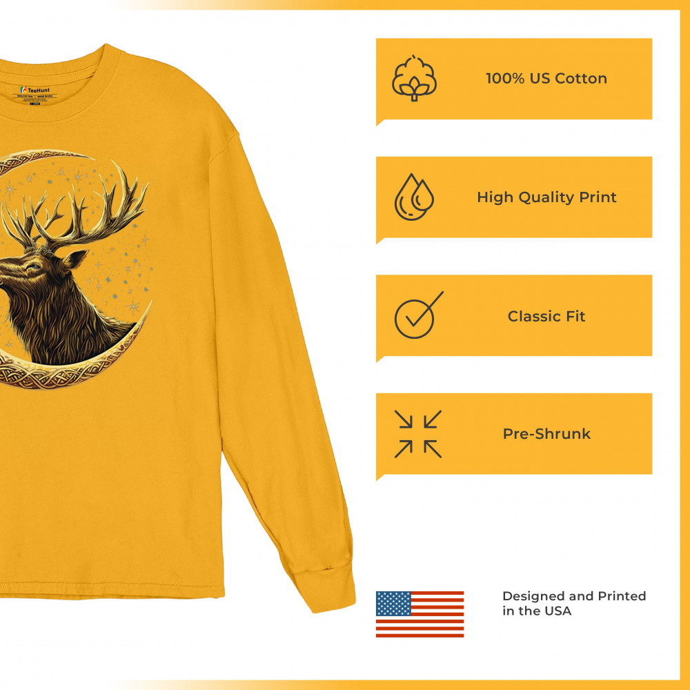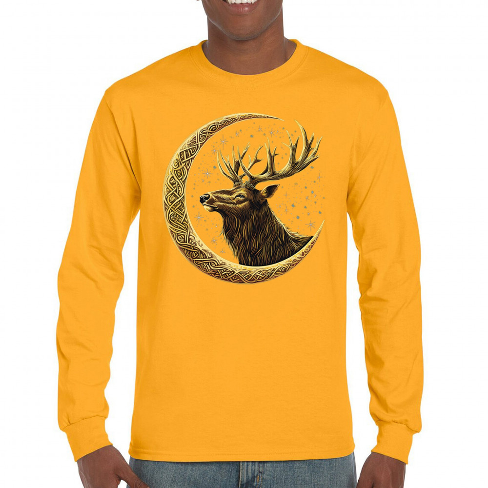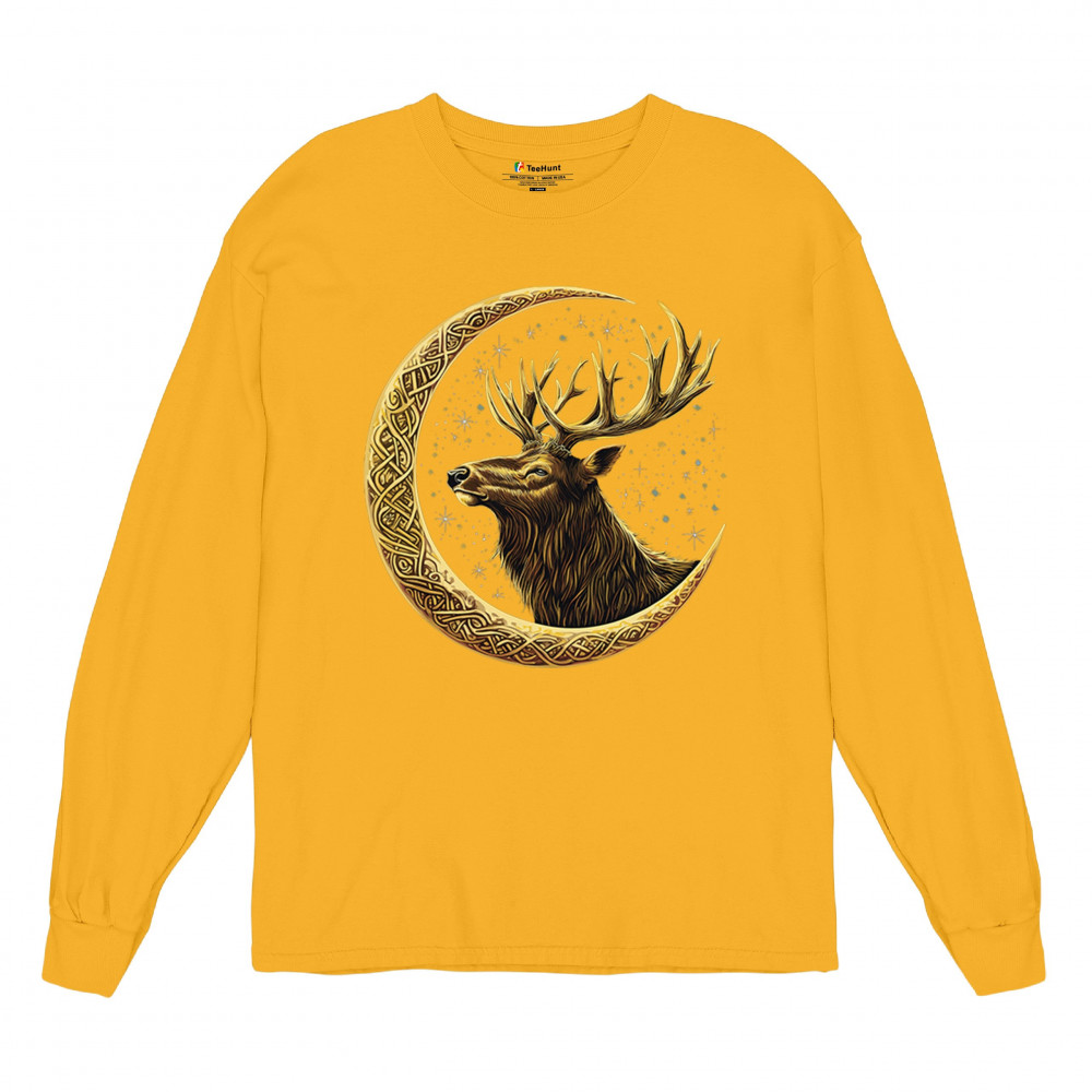 Celtic stag design with golden moon and cosmic stars. Symbolizes forest strength, leadership, and spiritual energy. Perfect for nature lovers.