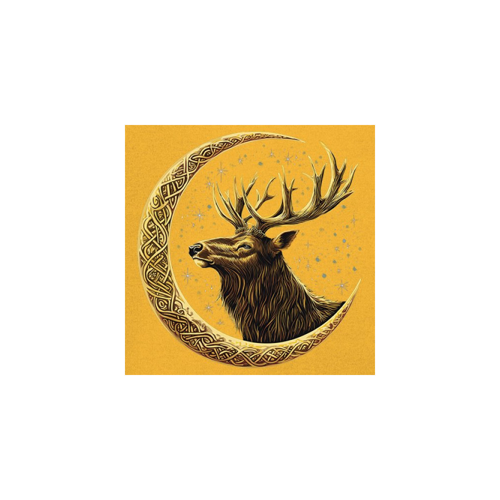 A majestic stag with bold antlers is framed by a glowing golden Celtic moon, set against a mystical night sky. This powerful image symbolizes strength, leadership, and spiritual connection to the forest. Perfect for fantasy fans, spiritual seekers, hunters, or anyone who honors nature, tribal themes, and cosmic symbolism.