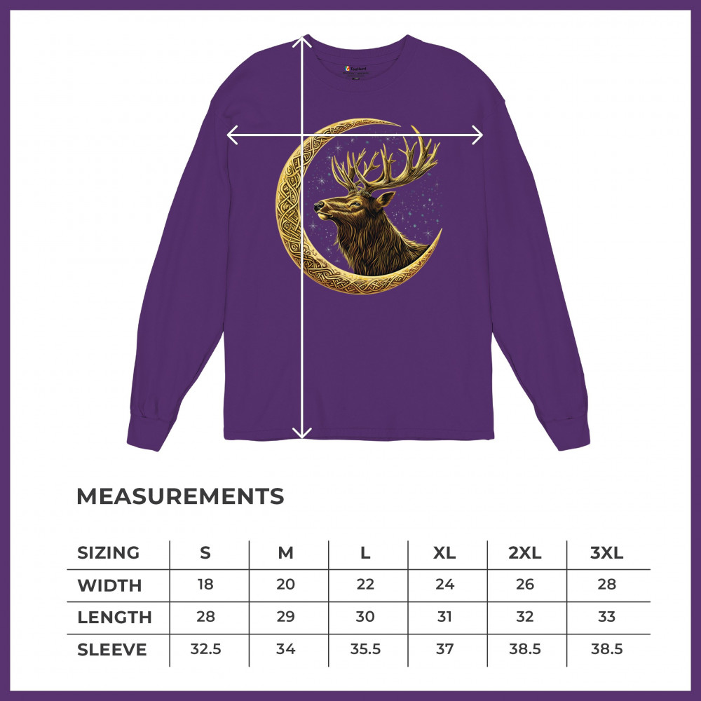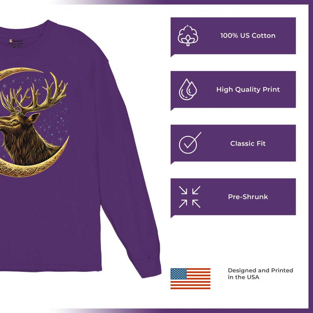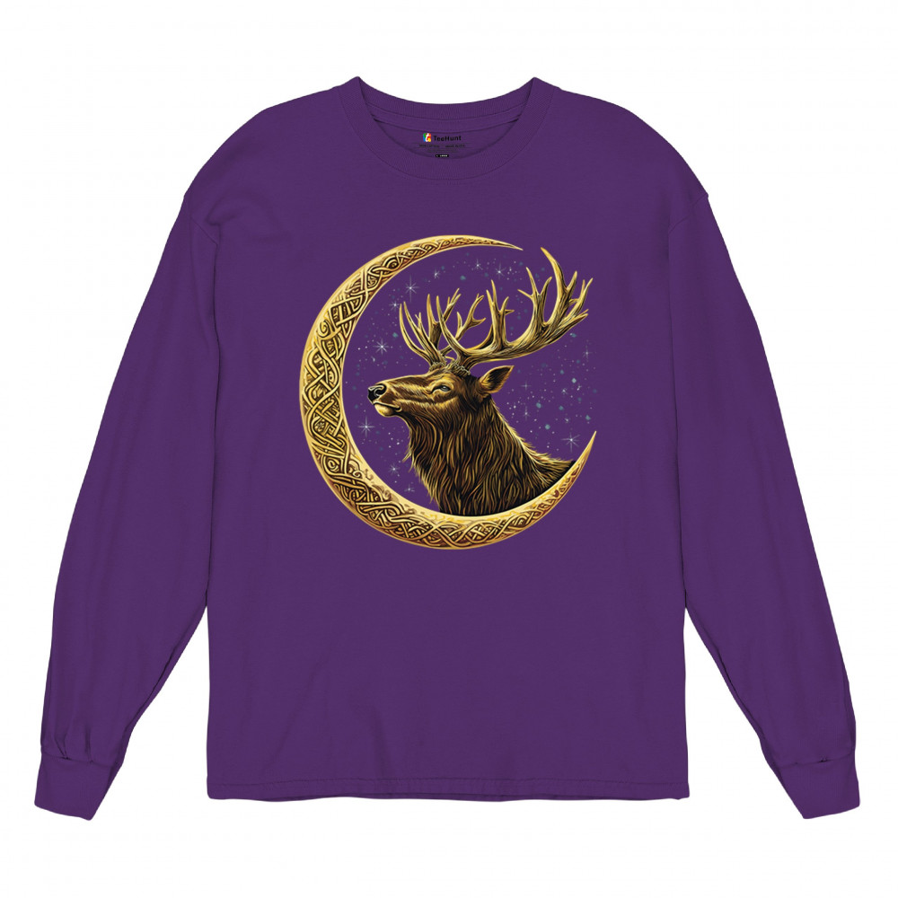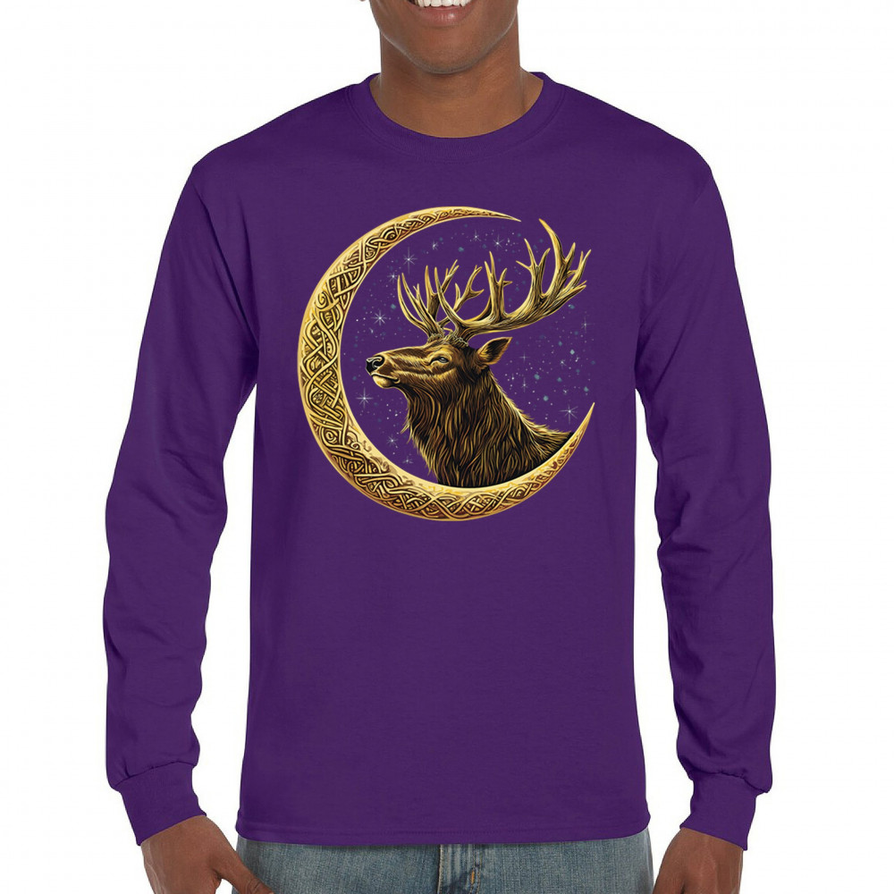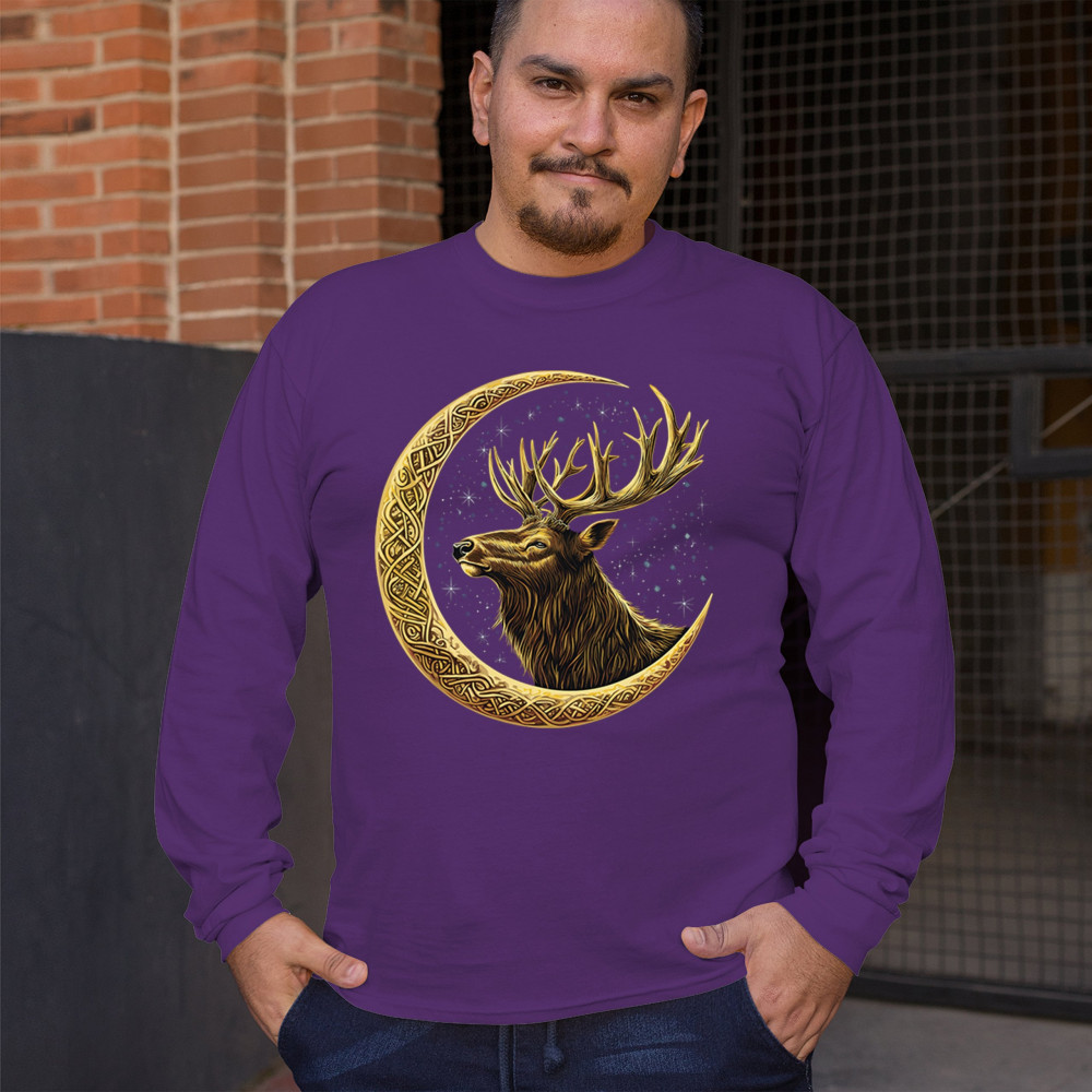 Celtic stag design with golden moon and cosmic stars. Symbolizes forest strength, leadership, and spiritual energy. Perfect for nature lovers.