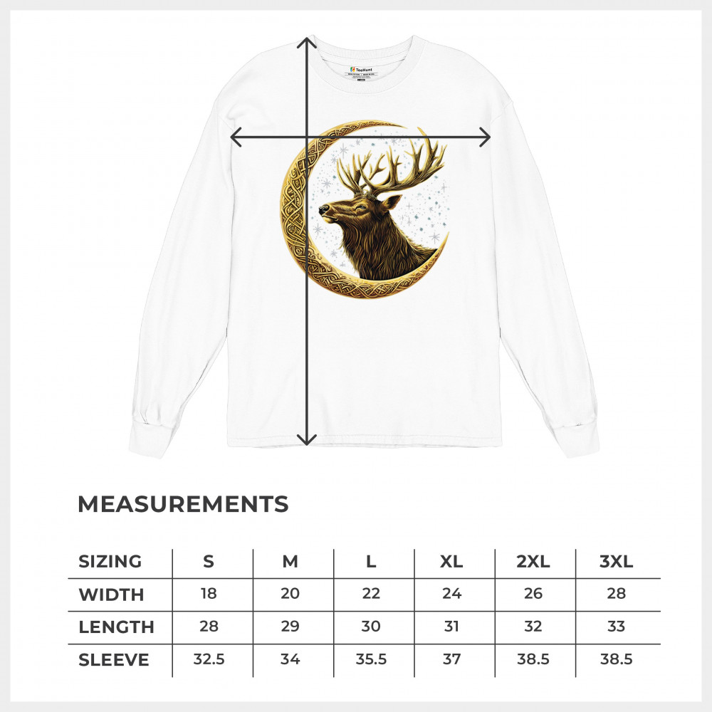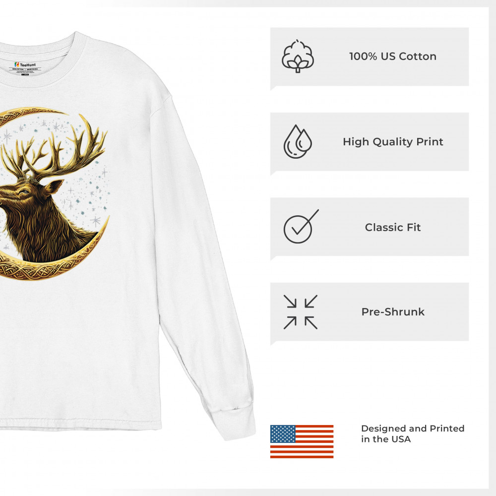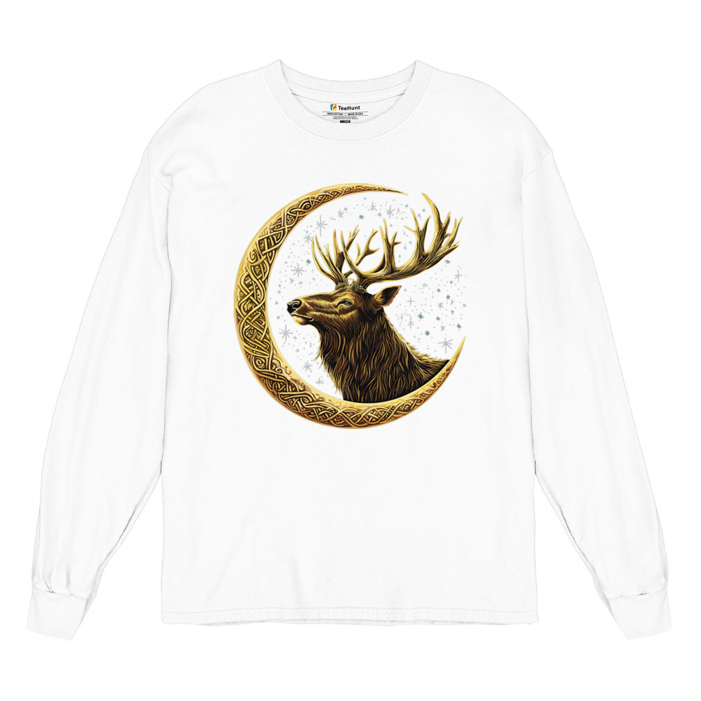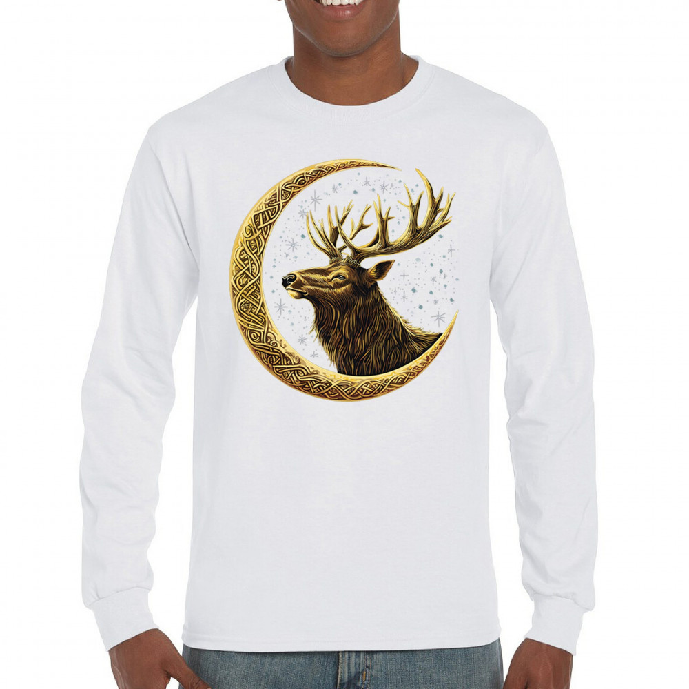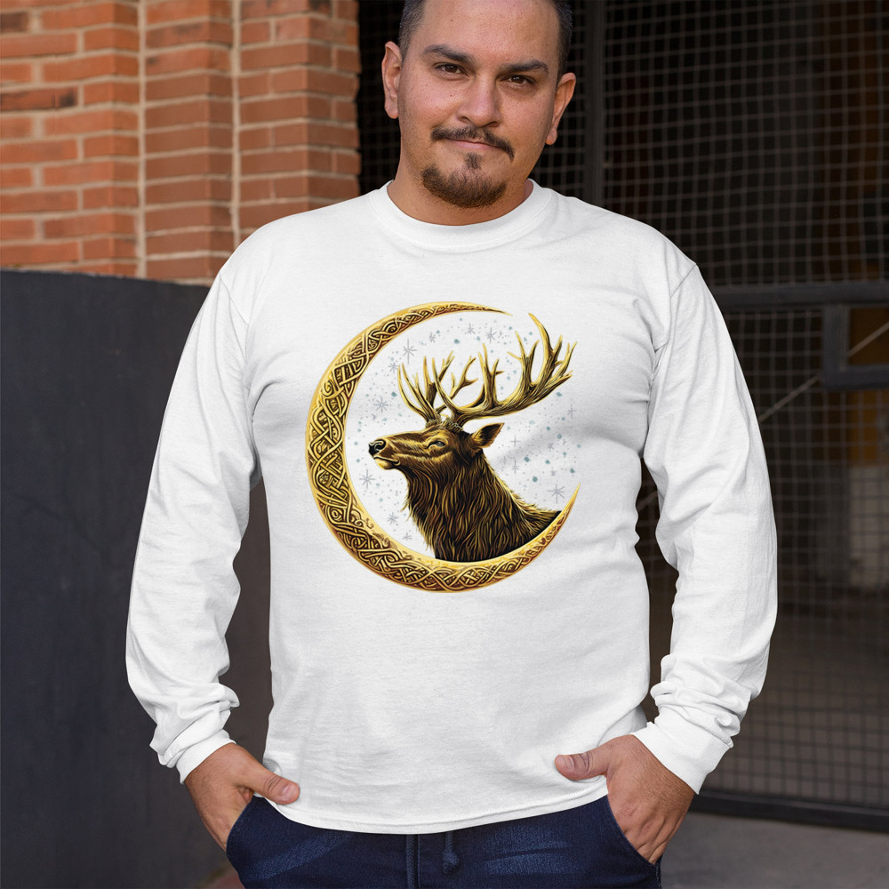 Celtic stag design with golden moon and cosmic stars. Symbolizes forest strength, leadership, and spiritual energy. Perfect for nature lovers.