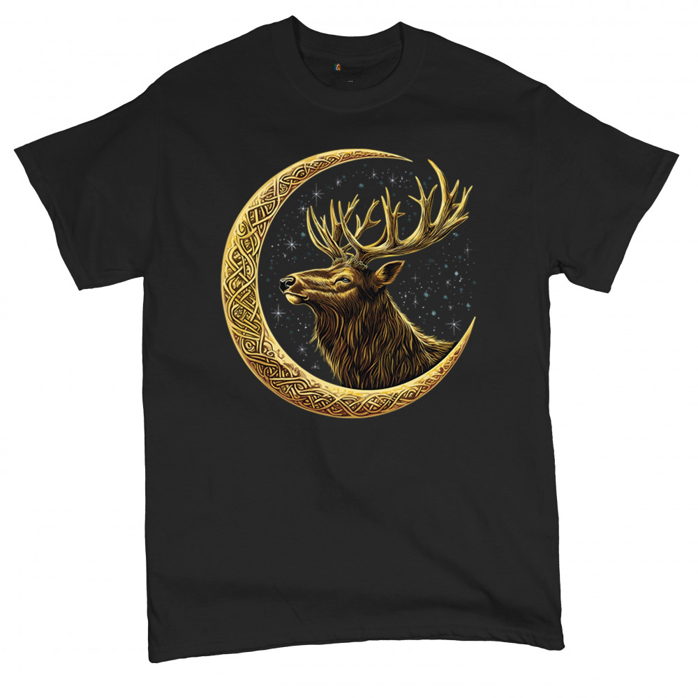 Celtic stag design with golden moon and cosmic stars. Symbolizes forest strength, leadership, and spiritual energy. Perfect for nature lovers.