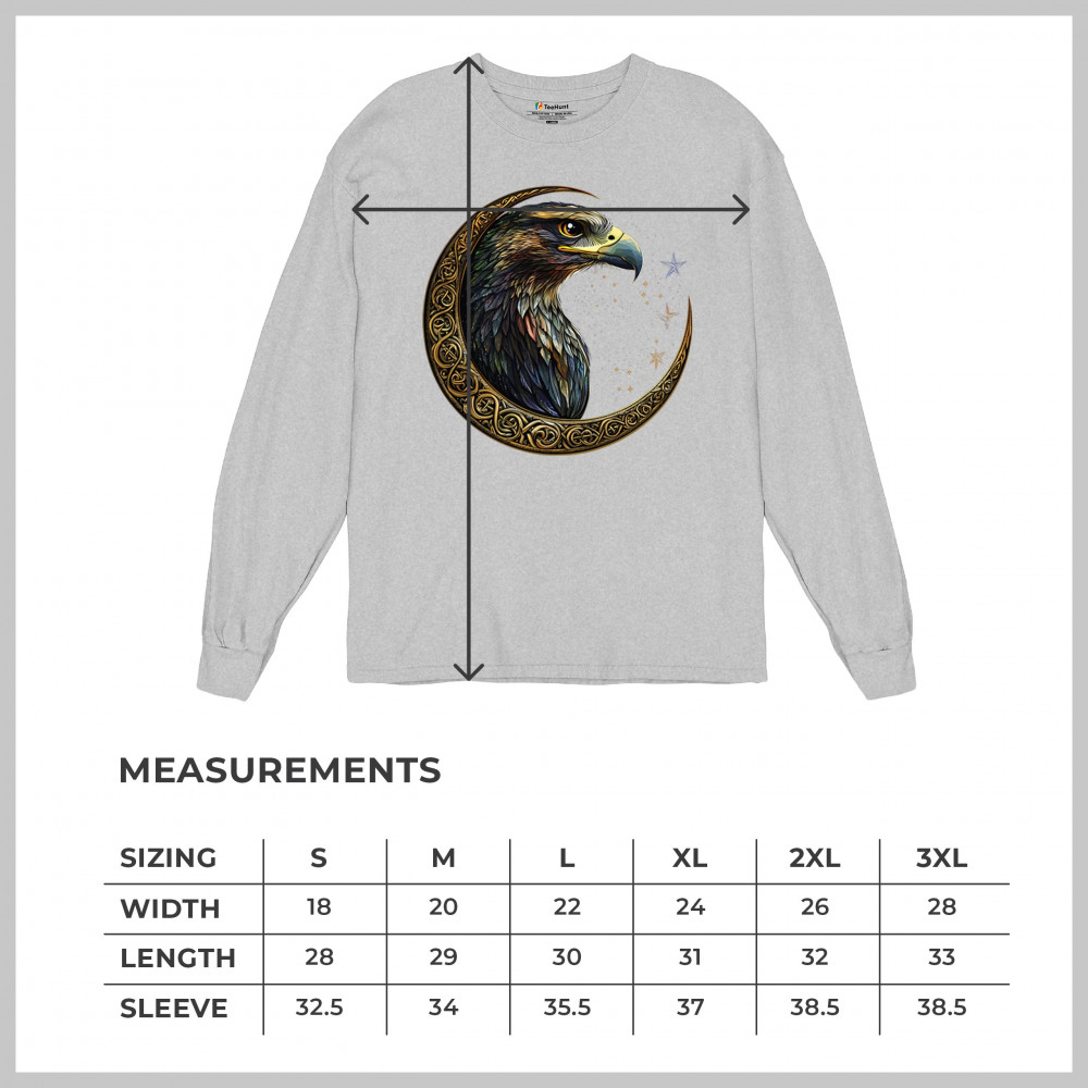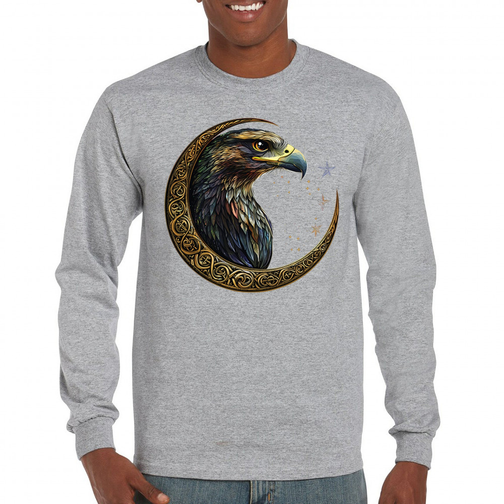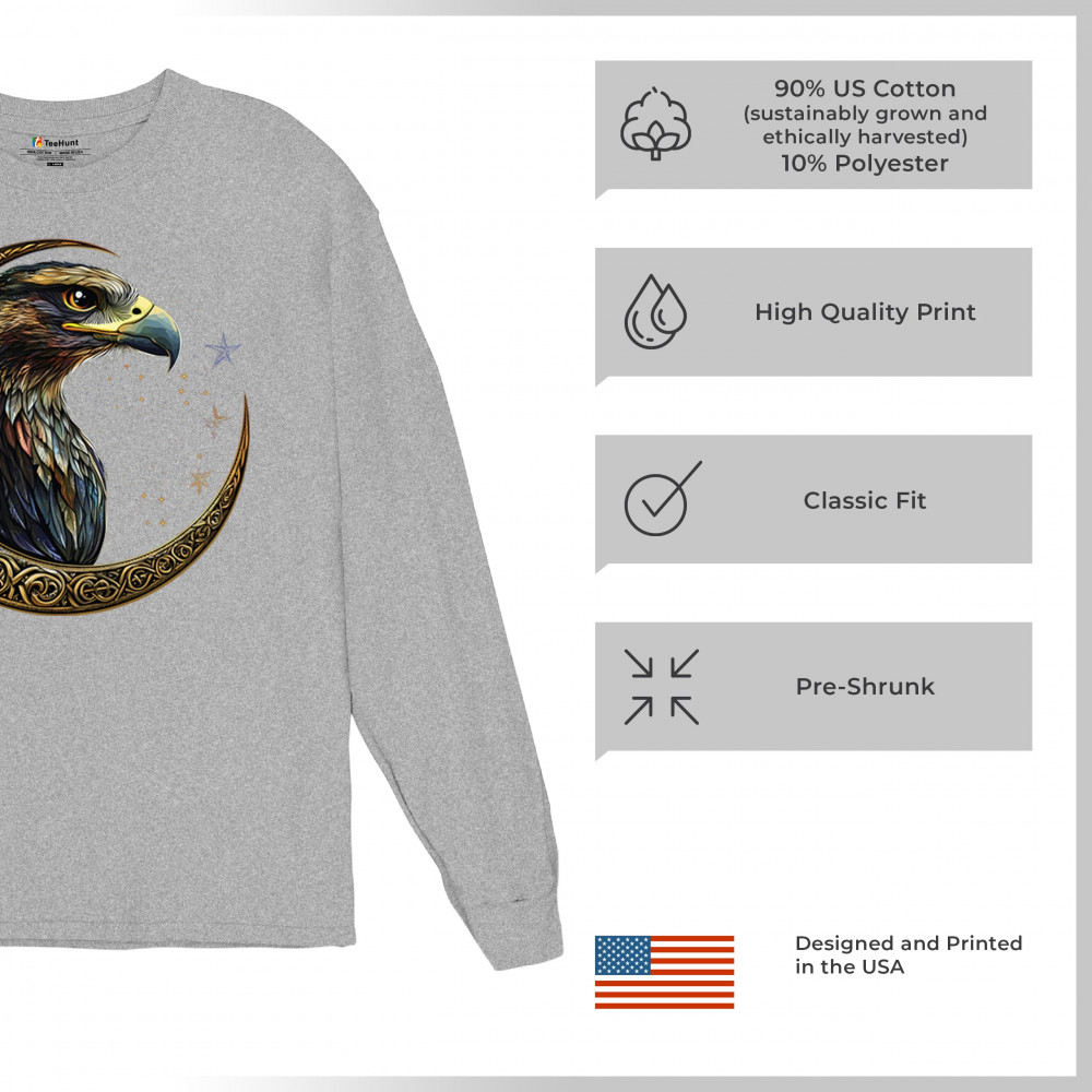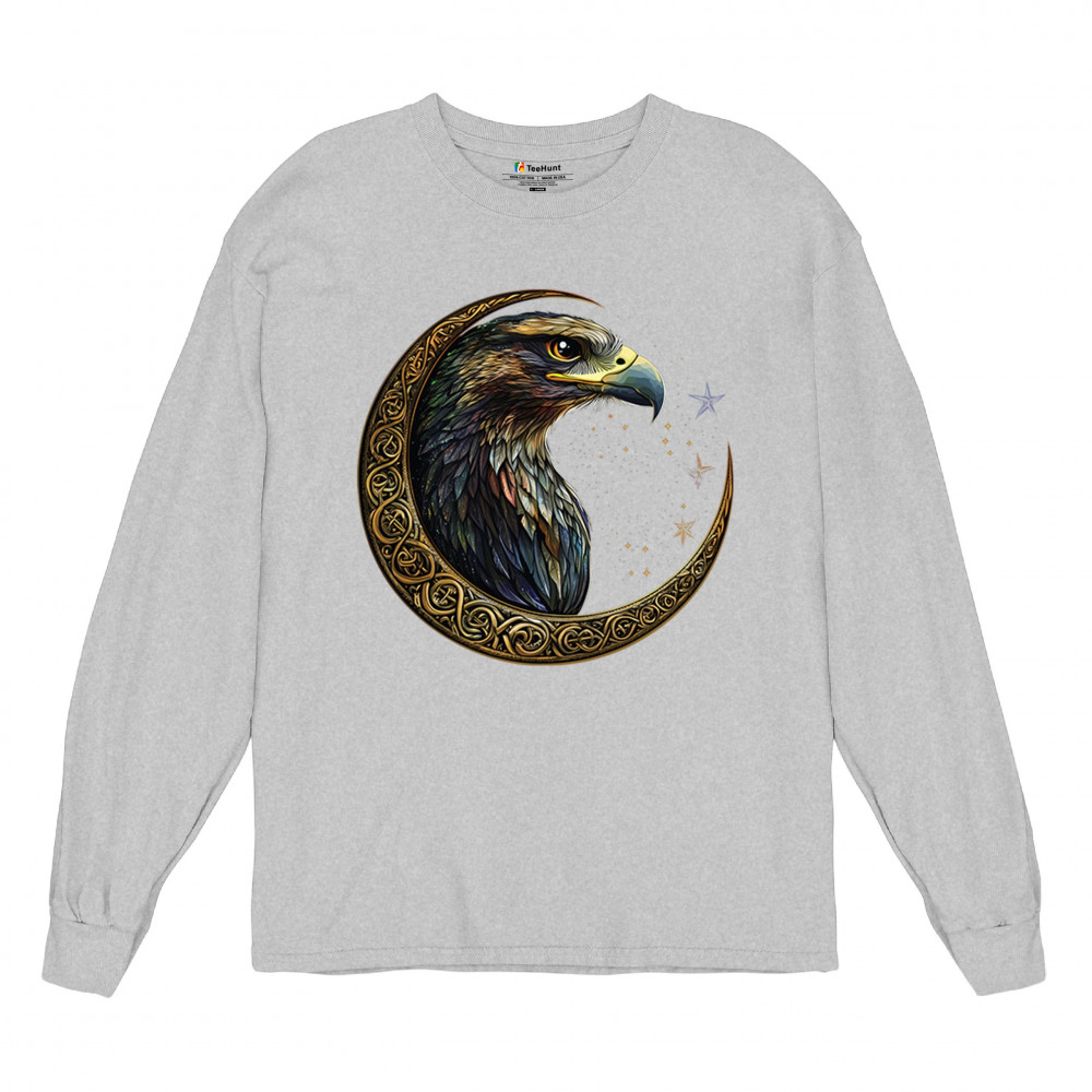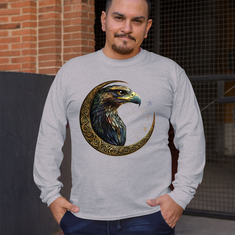 A beautifully detailed eagle with vibrant feathers is framed by a golden Celtic crescent moon and surrounded by a starry cosmic sky. This striking design represents freedom, spiritual power, and the mystery of the skies. Perfect for patriots, bird lovers, and those who connect with nature, tribal symbolism, and celestial art.