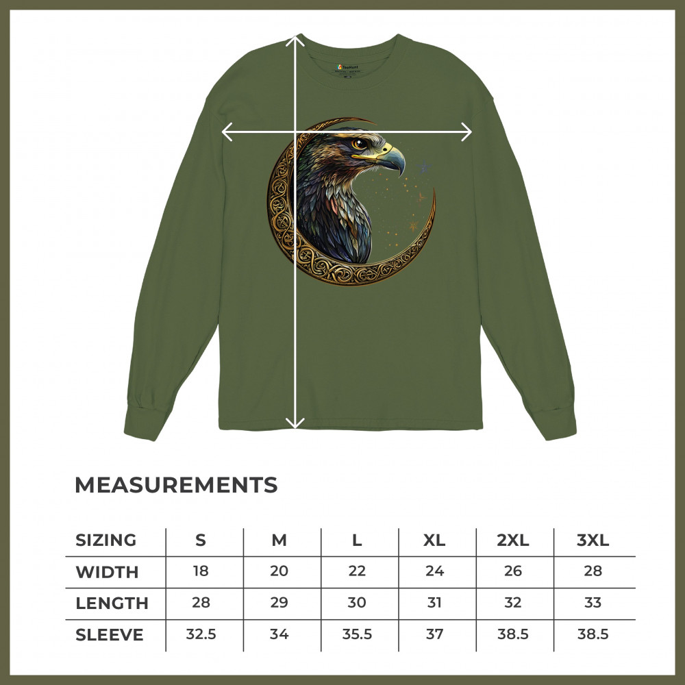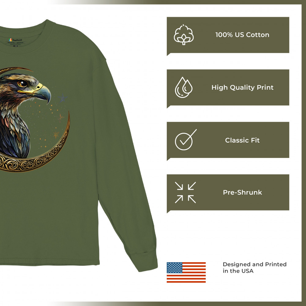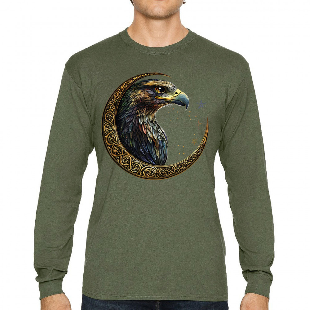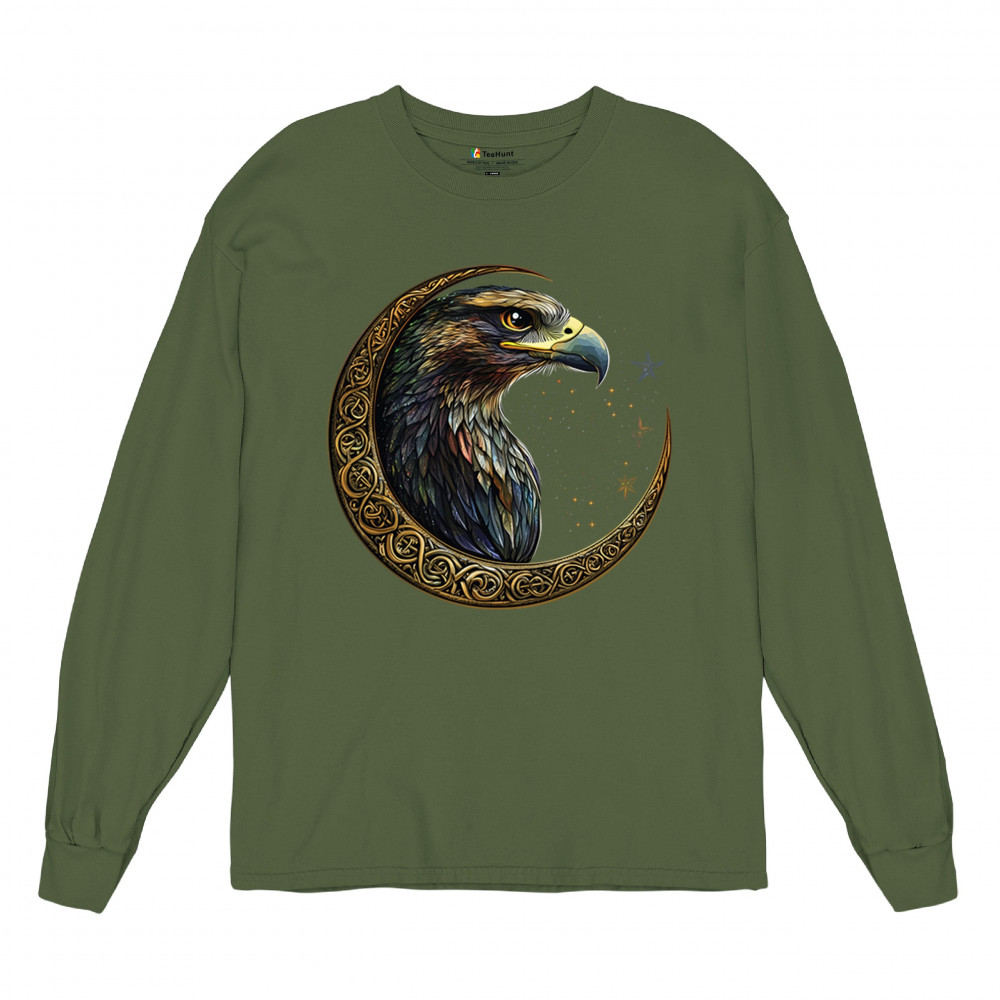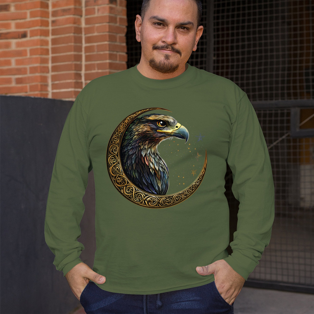 A beautifully detailed eagle with vibrant feathers is framed by a golden Celtic crescent moon and surrounded by a starry cosmic sky. This striking design represents freedom, spiritual power, and the mystery of the skies. Perfect for patriots, bird lovers, and those who connect with nature, tribal symbolism, and celestial art.