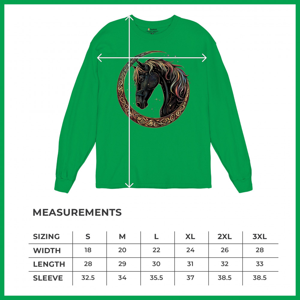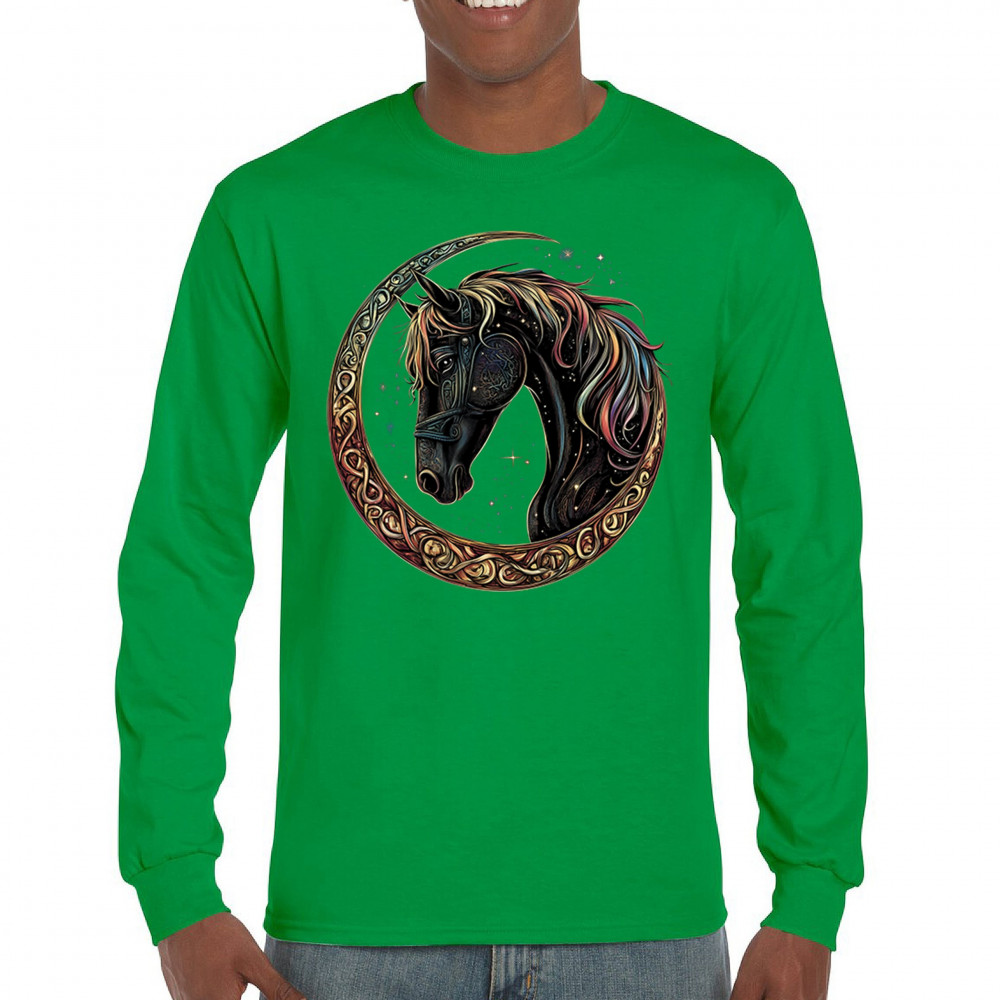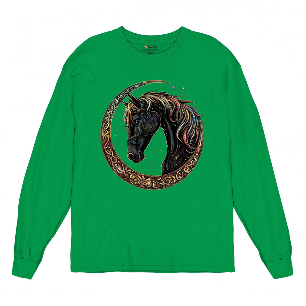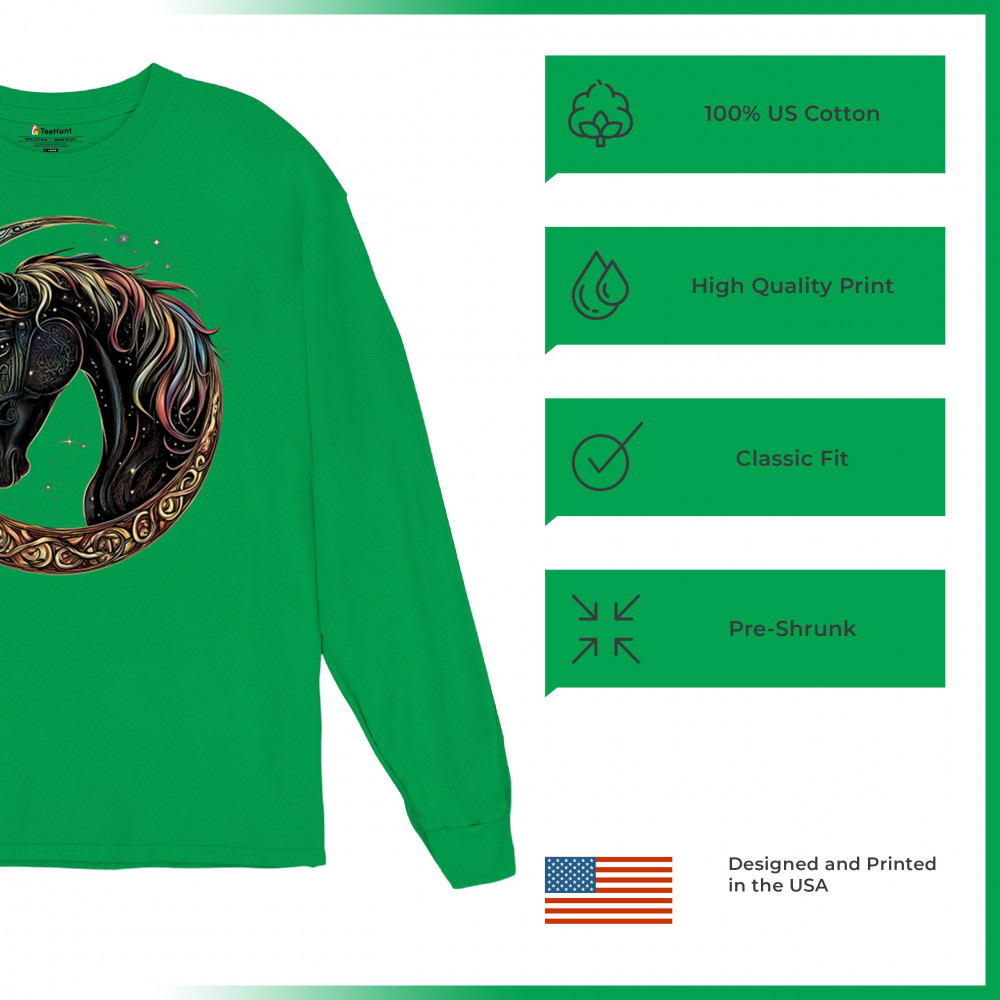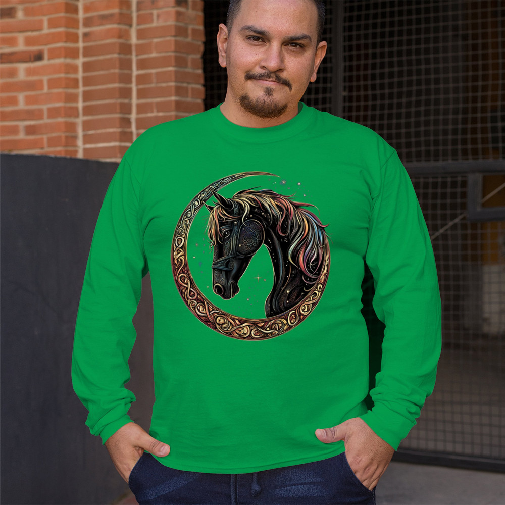 Celebrate the power and grace of the cosmos with this majestic black horse framed by a golden Celtic crescent moon. Its rainbow mane and celestial body symbolize strength, movement, mystery, and spiritual magic. A stunning piece for fantasy fans, equestrians, and dreamers who love horses and stars.