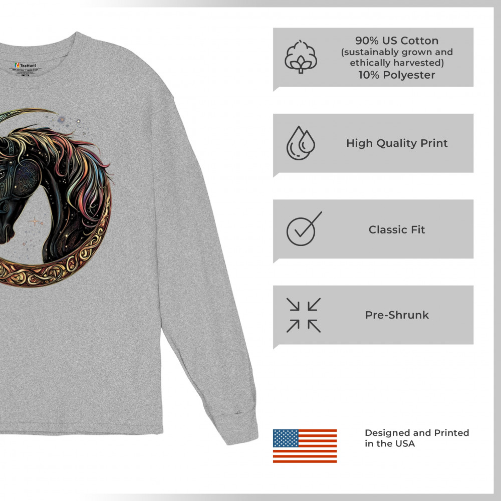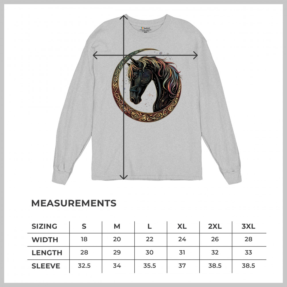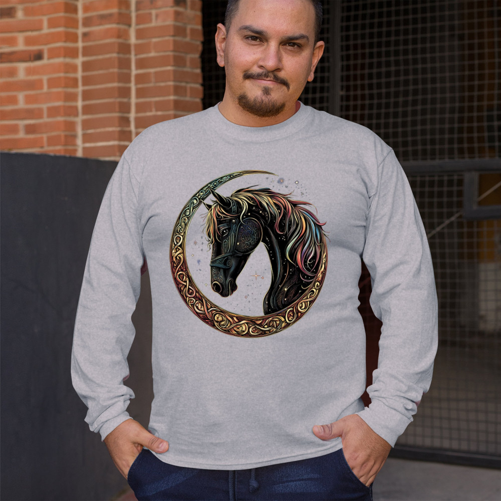 Celebrate the power and grace of the cosmos with this majestic black horse framed by a golden Celtic crescent moon. Its rainbow mane and celestial body symbolize strength, movement, mystery, and spiritual magic. A stunning piece for fantasy fans, equestrians, and dreamers who love horses and stars.