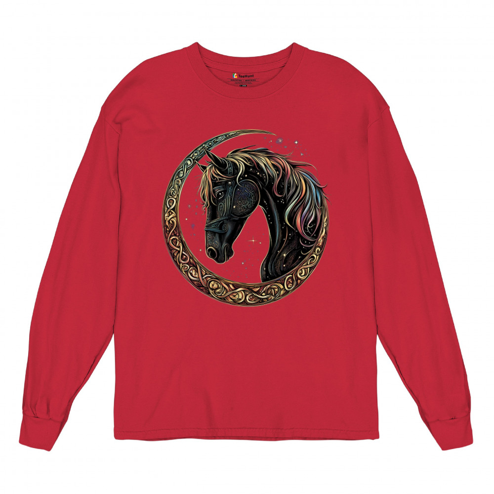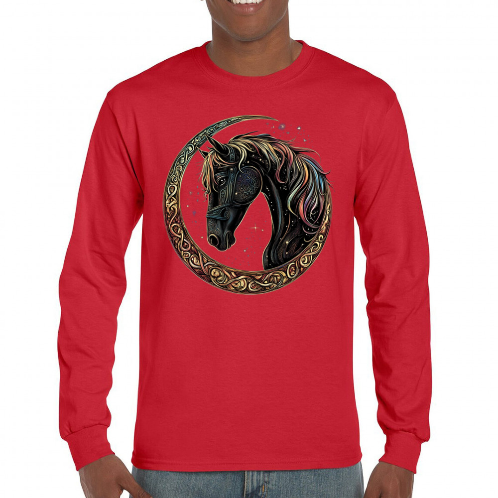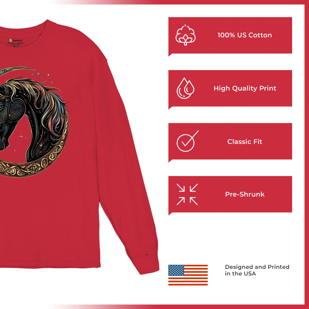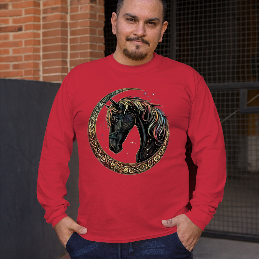 Celebrate the power and grace of the cosmos with this majestic black horse framed by a golden Celtic crescent moon. Its rainbow mane and celestial body symbolize strength, movement, mystery, and spiritual magic. A stunning piece for fantasy fans, equestrians, and dreamers who love horses and stars.
