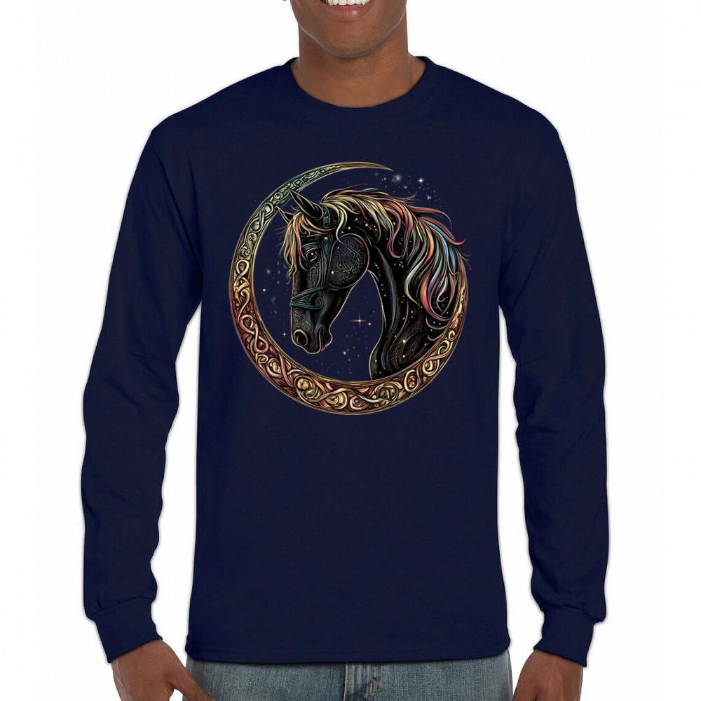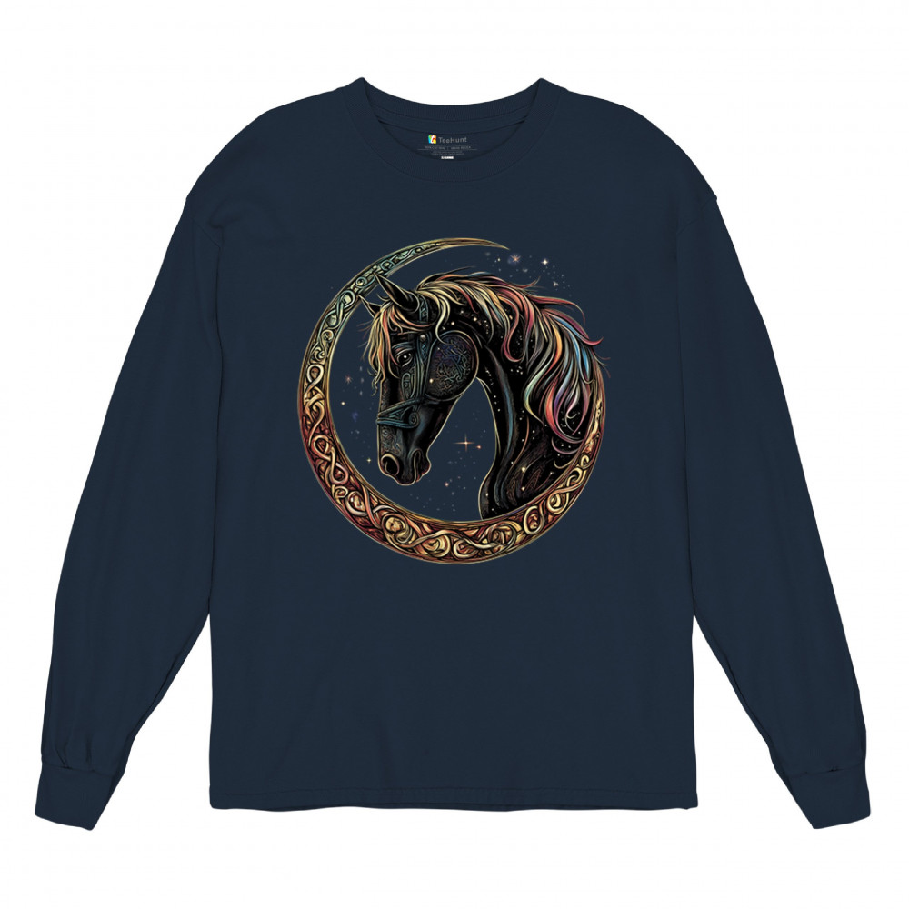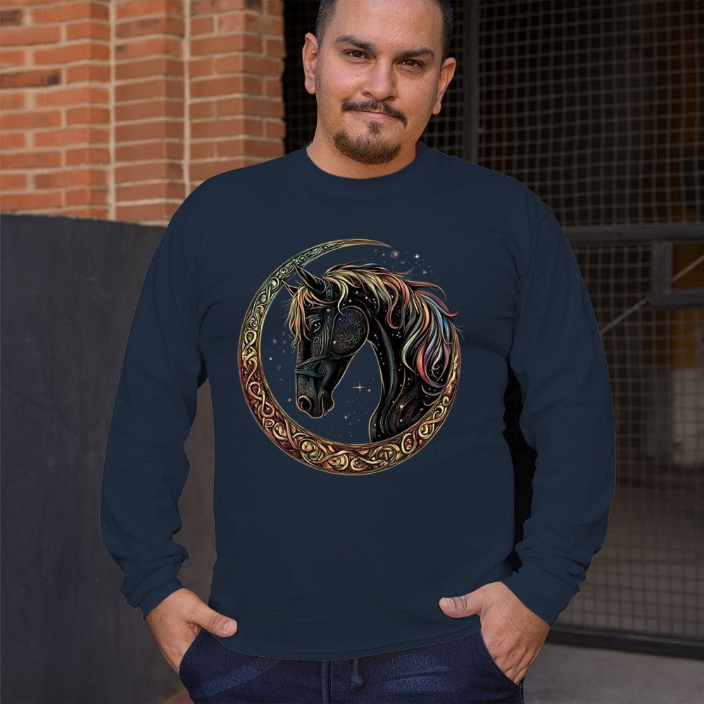 Celebrate the power and grace of the cosmos with this majestic black horse framed by a golden Celtic crescent moon. Its rainbow mane and celestial body symbolize strength, movement, mystery, and spiritual magic. A stunning piece for fantasy fans, equestrians, and dreamers who love horses and stars.