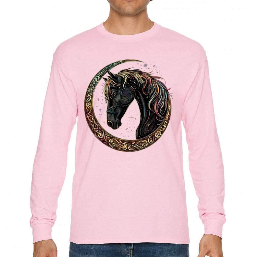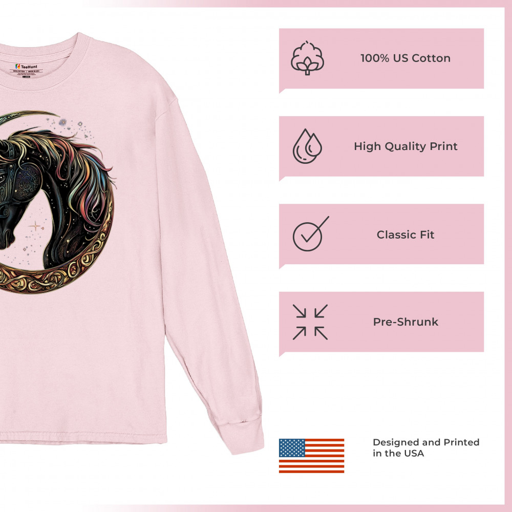 Celestial black horse with rainbow mane in Celtic moon. A mystical tribute to strength, movement, and spiritual beauty for horse and fantasy lovers.