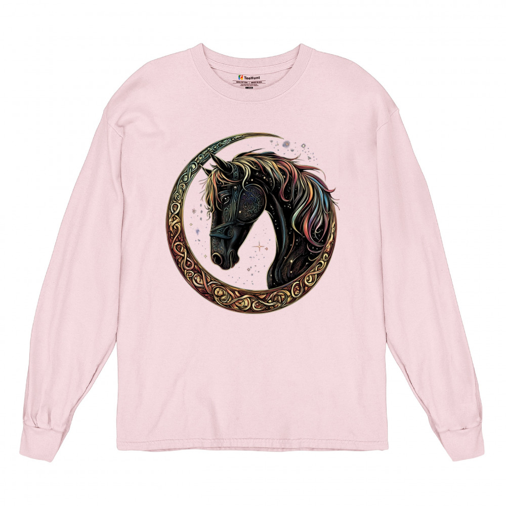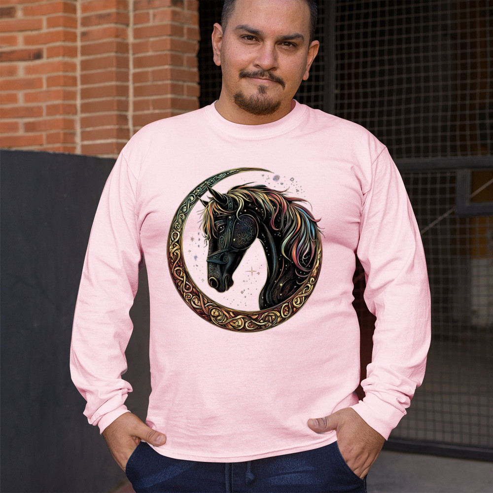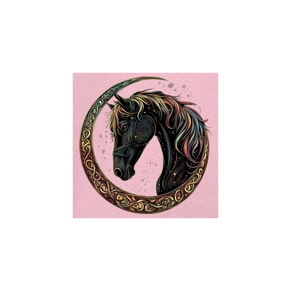 Celebrate the power and grace of the cosmos with this majestic black horse framed by a golden Celtic crescent moon. Its rainbow mane and celestial body symbolize strength, movement, mystery, and spiritual magic. A stunning piece for fantasy fans, equestrians, and dreamers who love horses and stars.