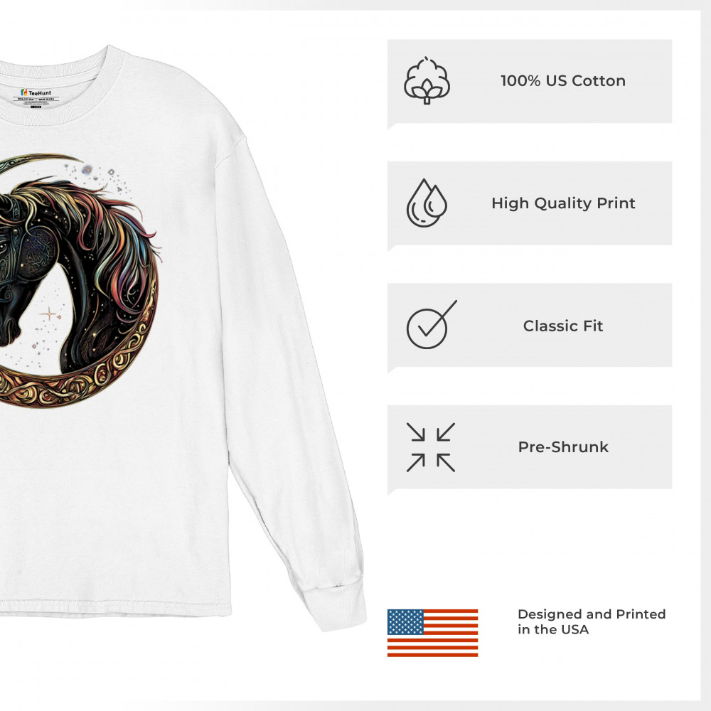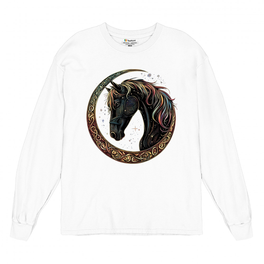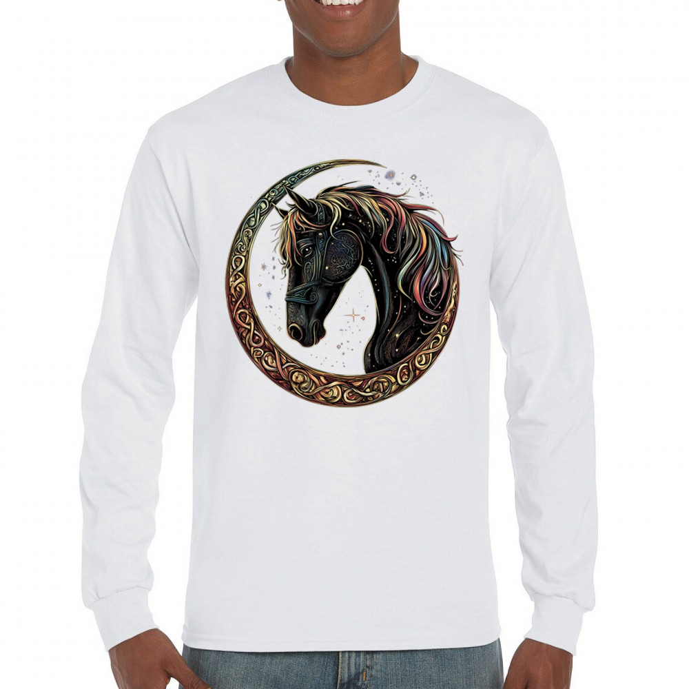 Celebrate the power and grace of the cosmos with this majestic black horse framed by a golden Celtic crescent moon. Its rainbow mane and celestial body symbolize strength, movement, mystery, and spiritual magic. A stunning piece for fantasy fans, equestrians, and dreamers who love horses and stars.