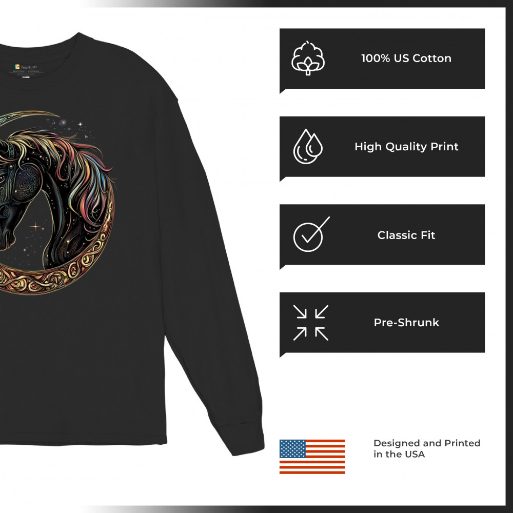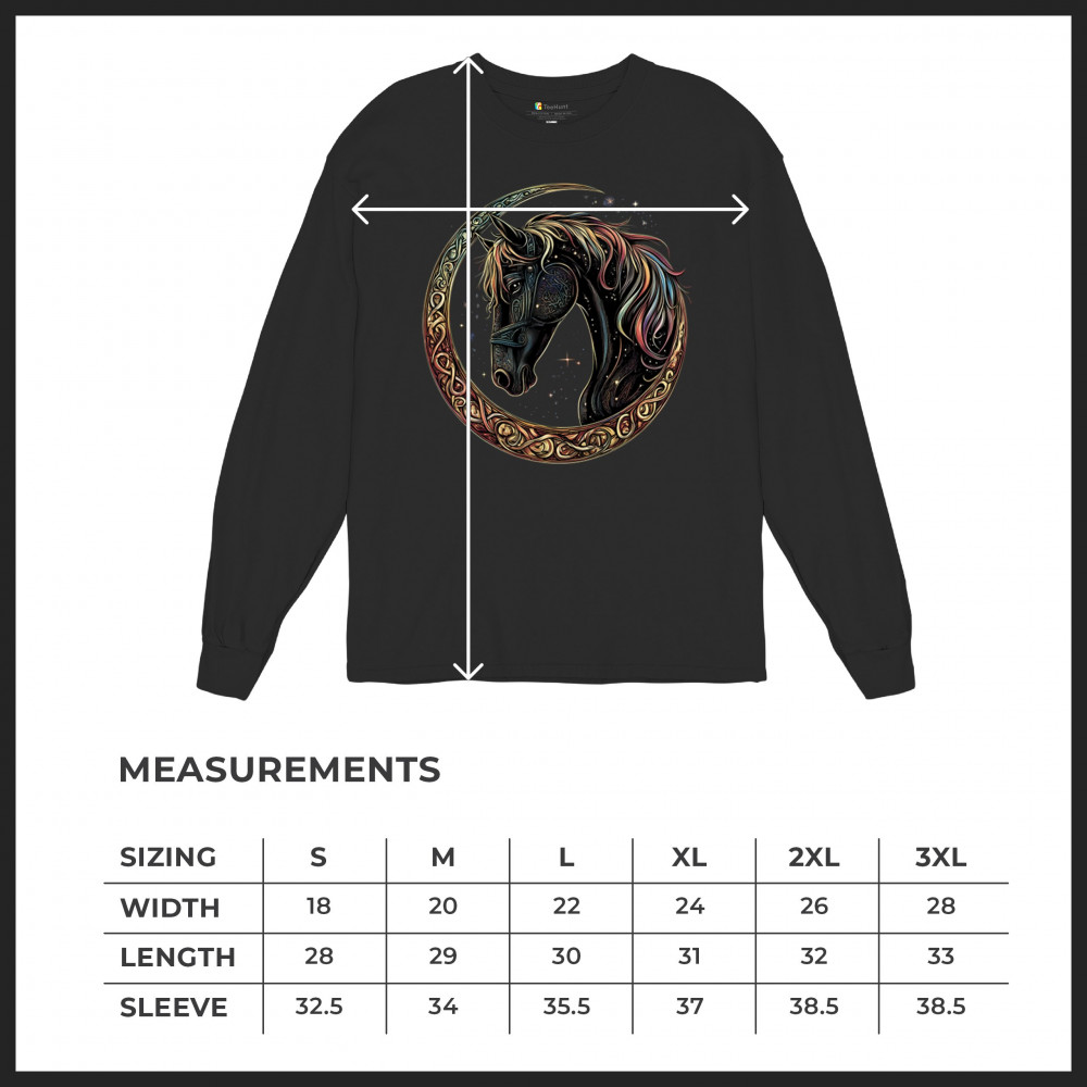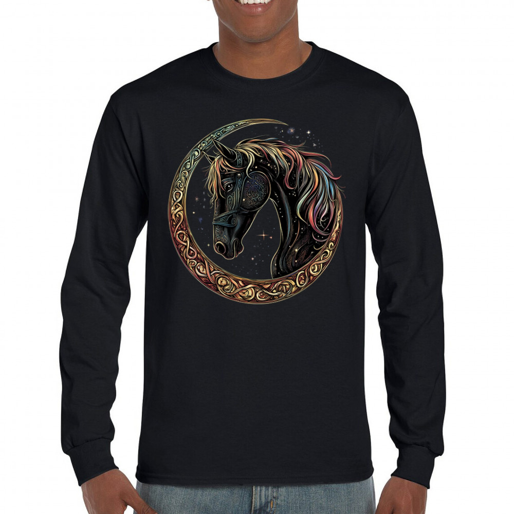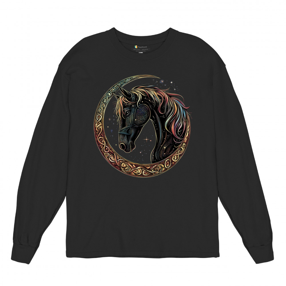 Celebrate the power and grace of the cosmos with this majestic black horse framed by a golden Celtic crescent moon. Its rainbow mane and celestial body symbolize strength, movement, mystery, and spiritual magic. A stunning piece for fantasy fans, equestrians, and dreamers who love horses and stars.