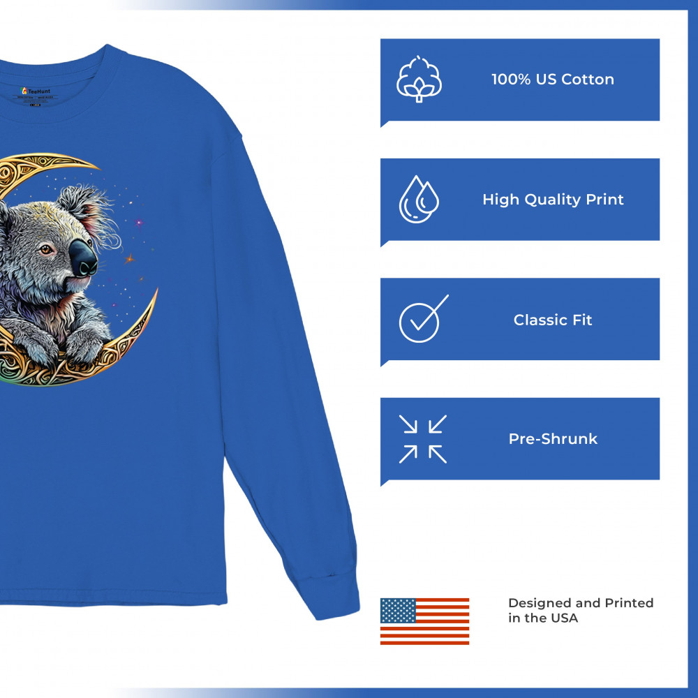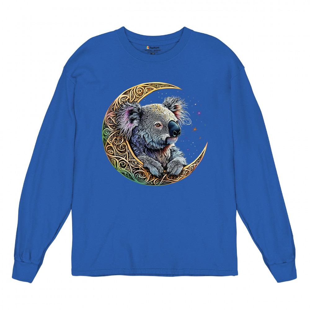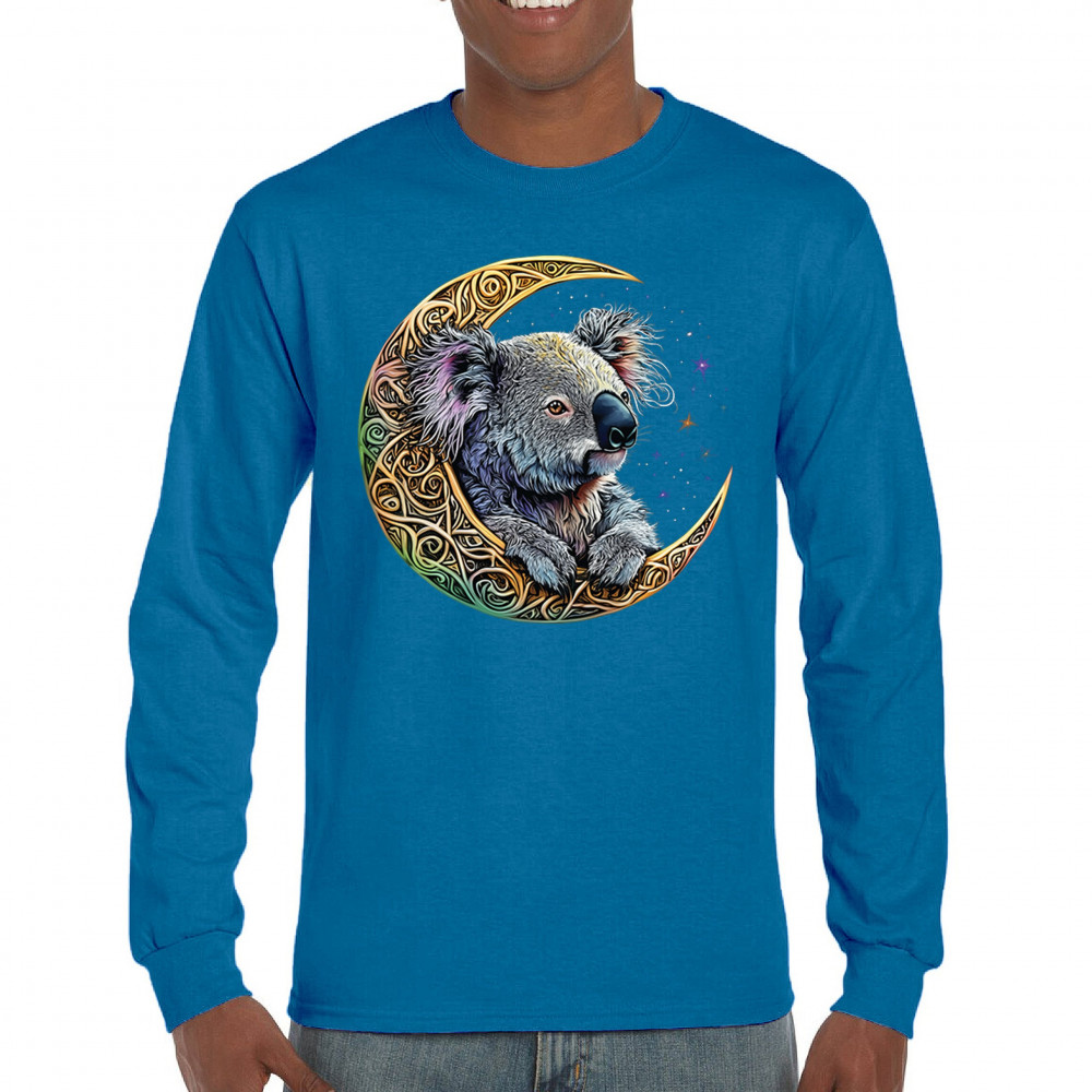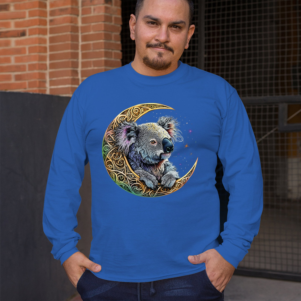 Koala resting in Celtic crescent moon with cosmic sky. A peaceful design for nature lovers, spiritual thinkers, and fantasy art fans.