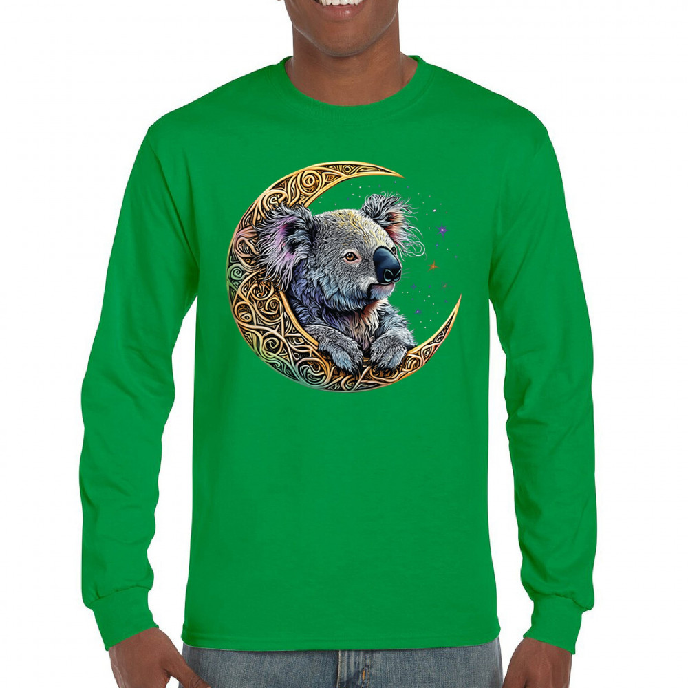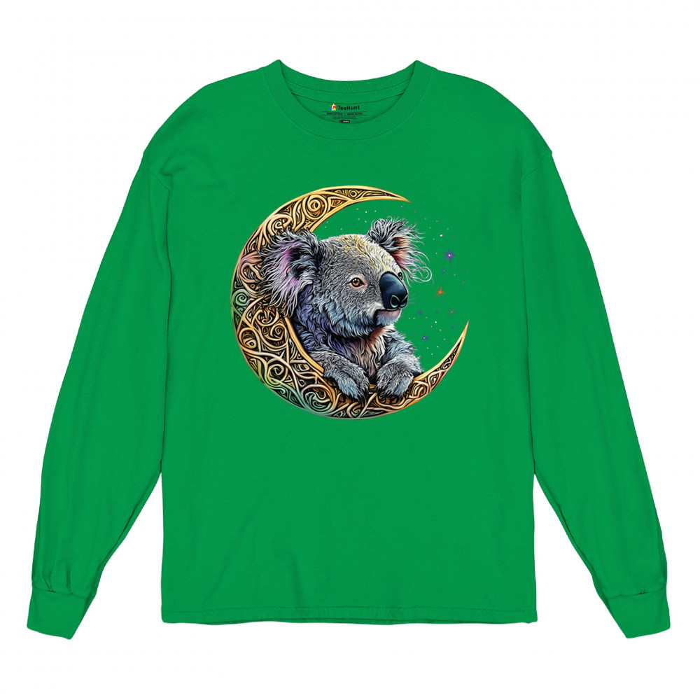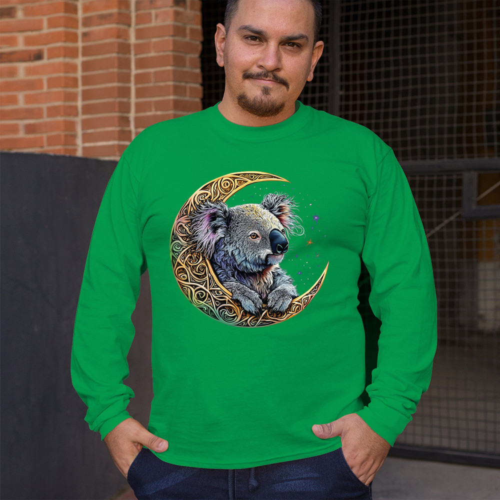 Koala resting in Celtic crescent moon with cosmic sky. A peaceful design for nature lovers, spiritual thinkers, and fantasy art fans.
