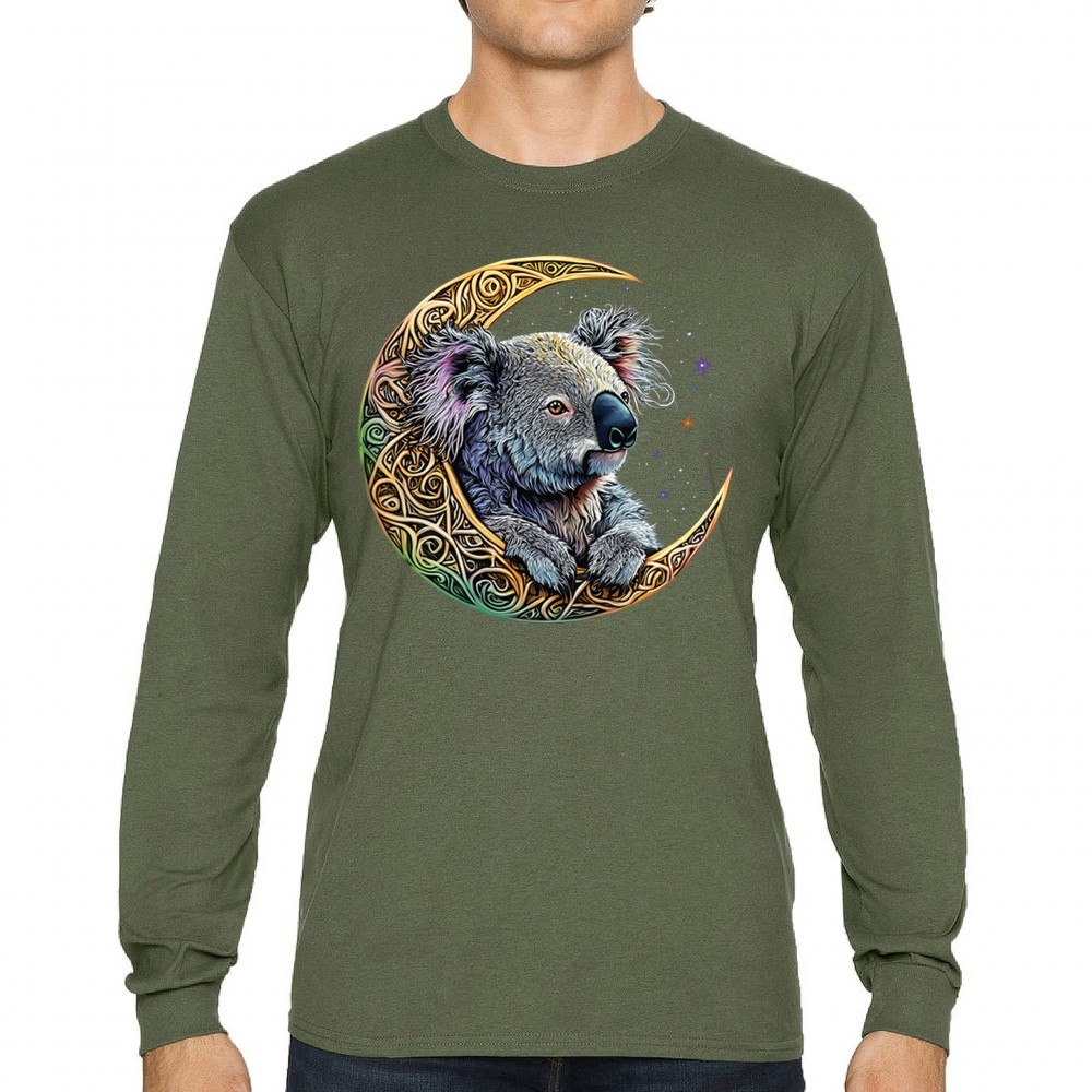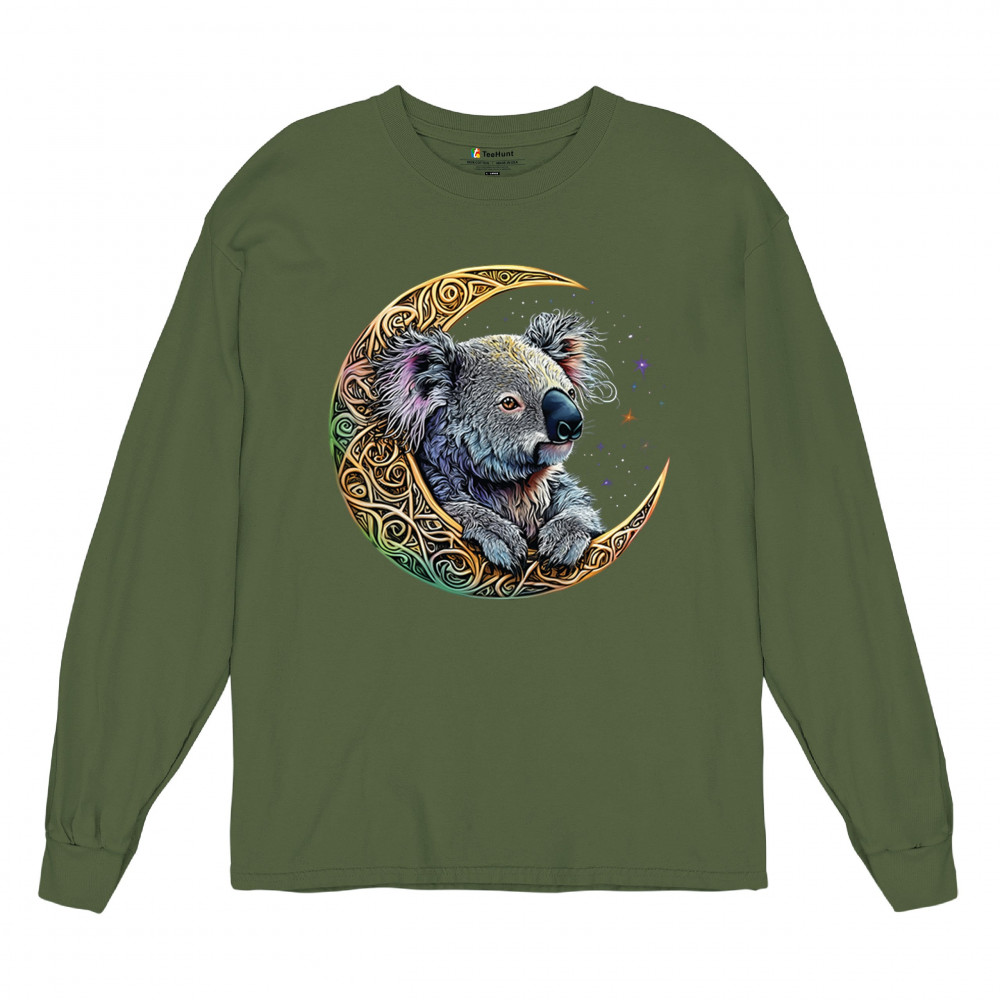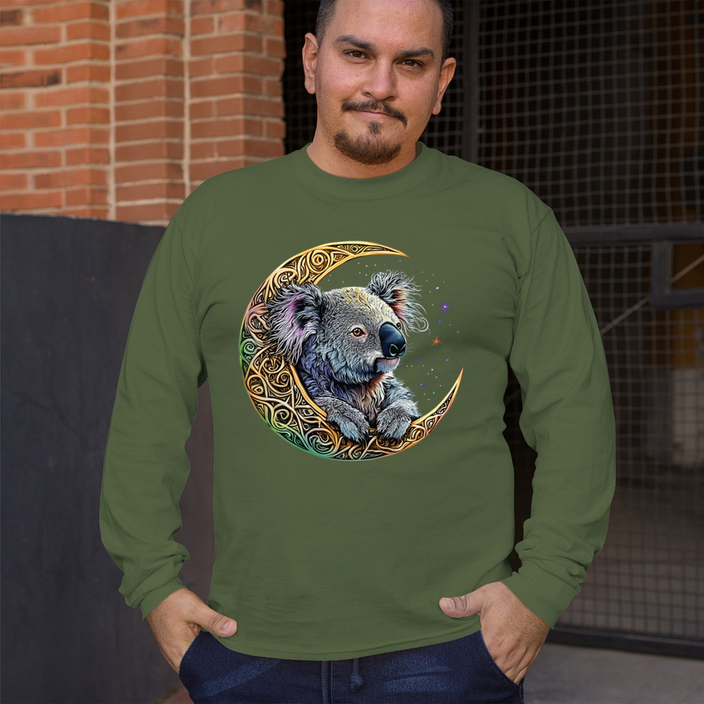 Koala resting in Celtic crescent moon with cosmic sky. A peaceful design for nature lovers, spiritual thinkers, and fantasy art fans.