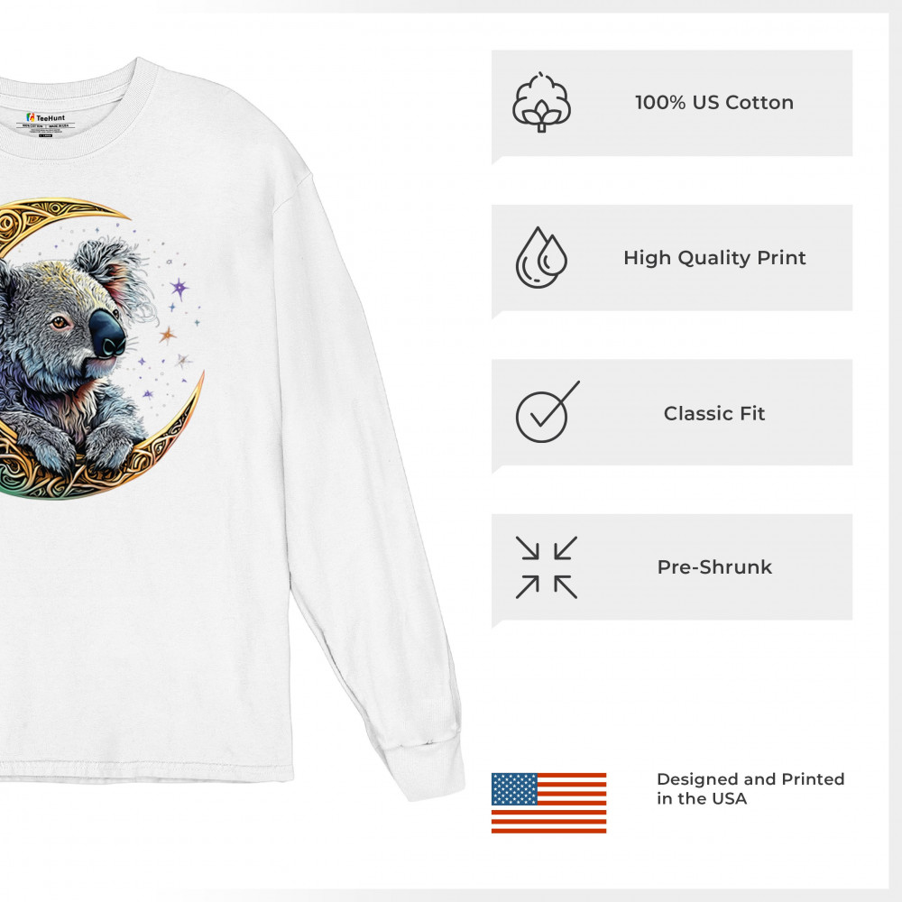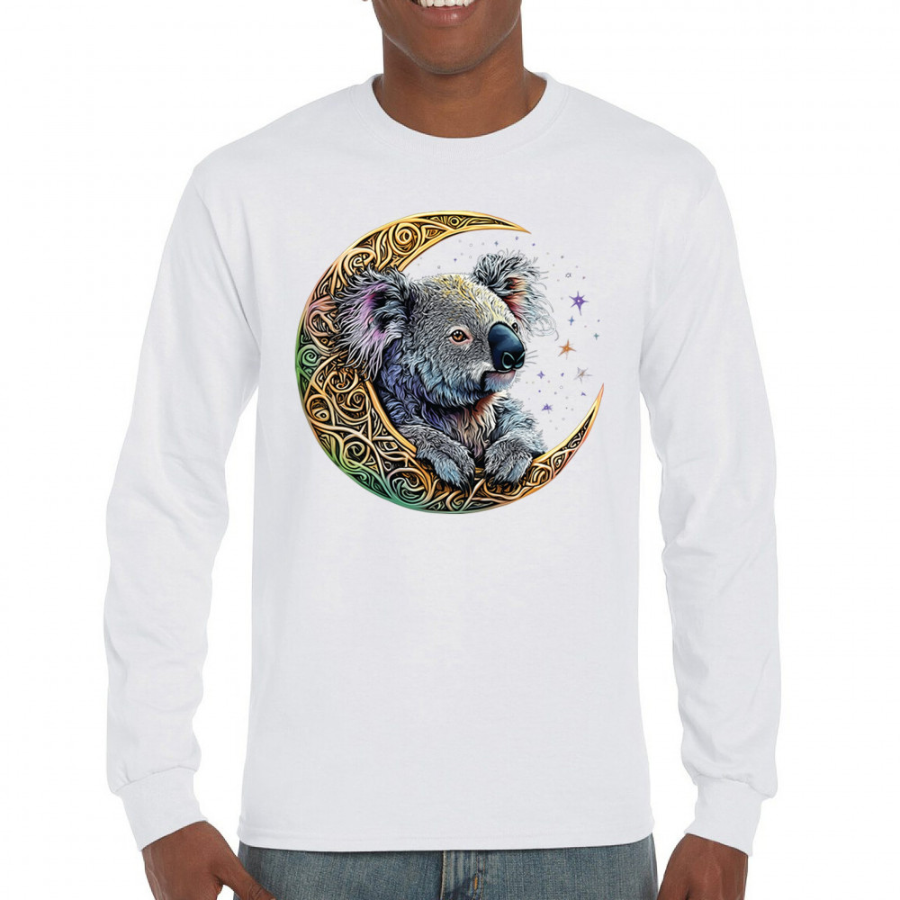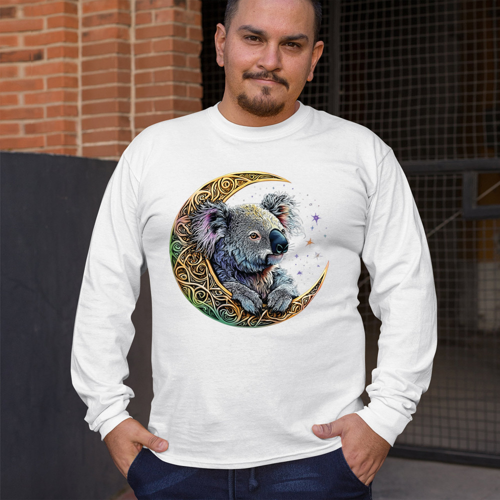 Koala resting in Celtic crescent moon with cosmic sky. A peaceful design for nature lovers, spiritual thinkers, and fantasy art fans.