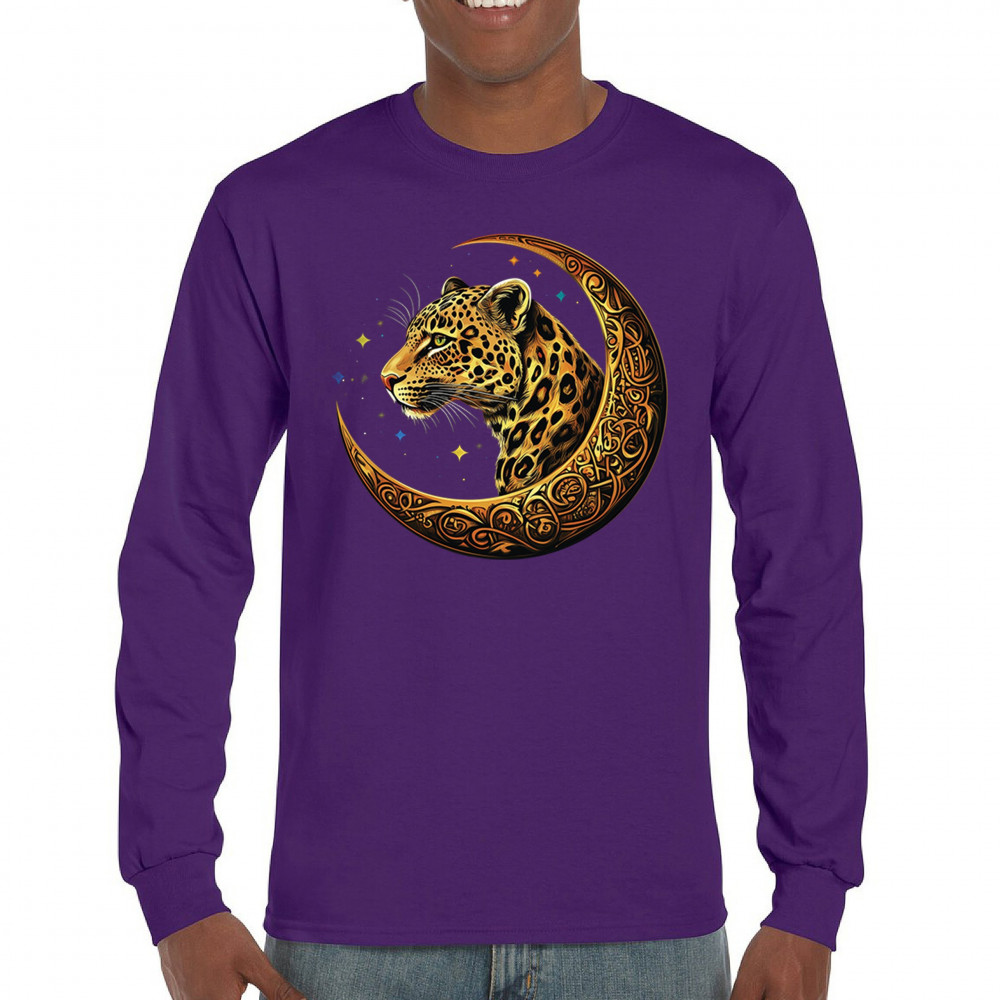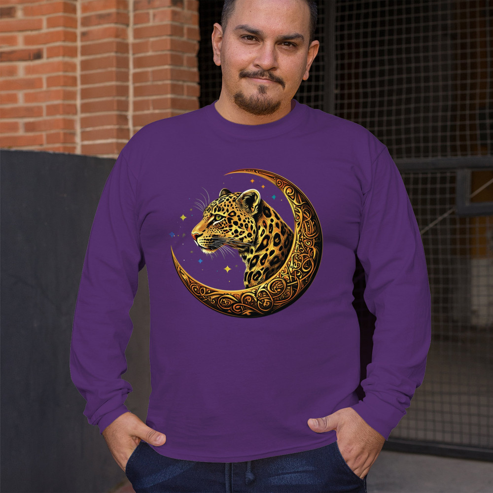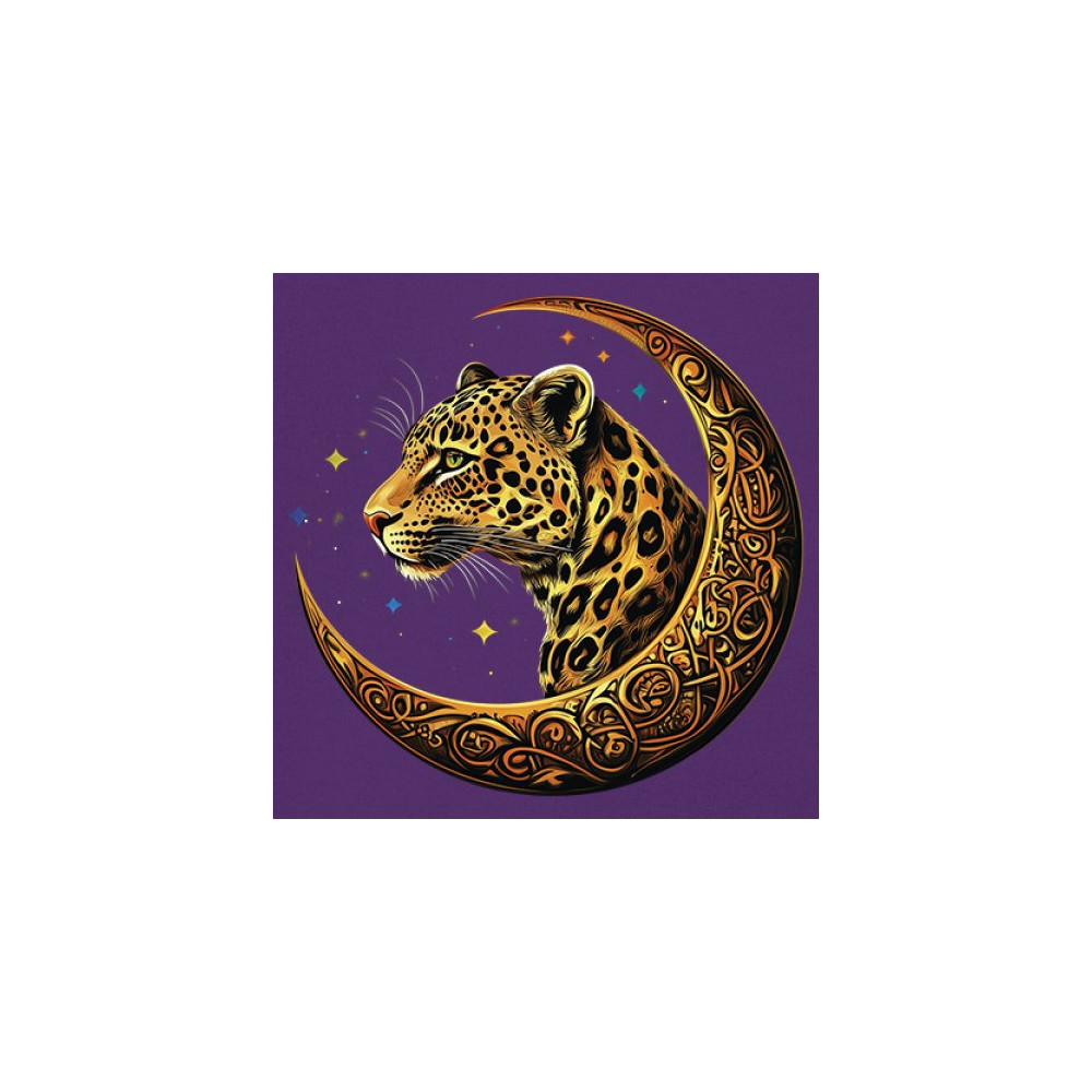 Unleash wild energy and spiritual symbolism with this bold leopard design set inside a golden Celtic crescent moon. A cosmic starry background amplifies its mystical vibe, symbolizing agility, independence, and awareness. Perfect for big cat lovers, jungle animal fans, and seekers of fantasy or tribal-inspired art.