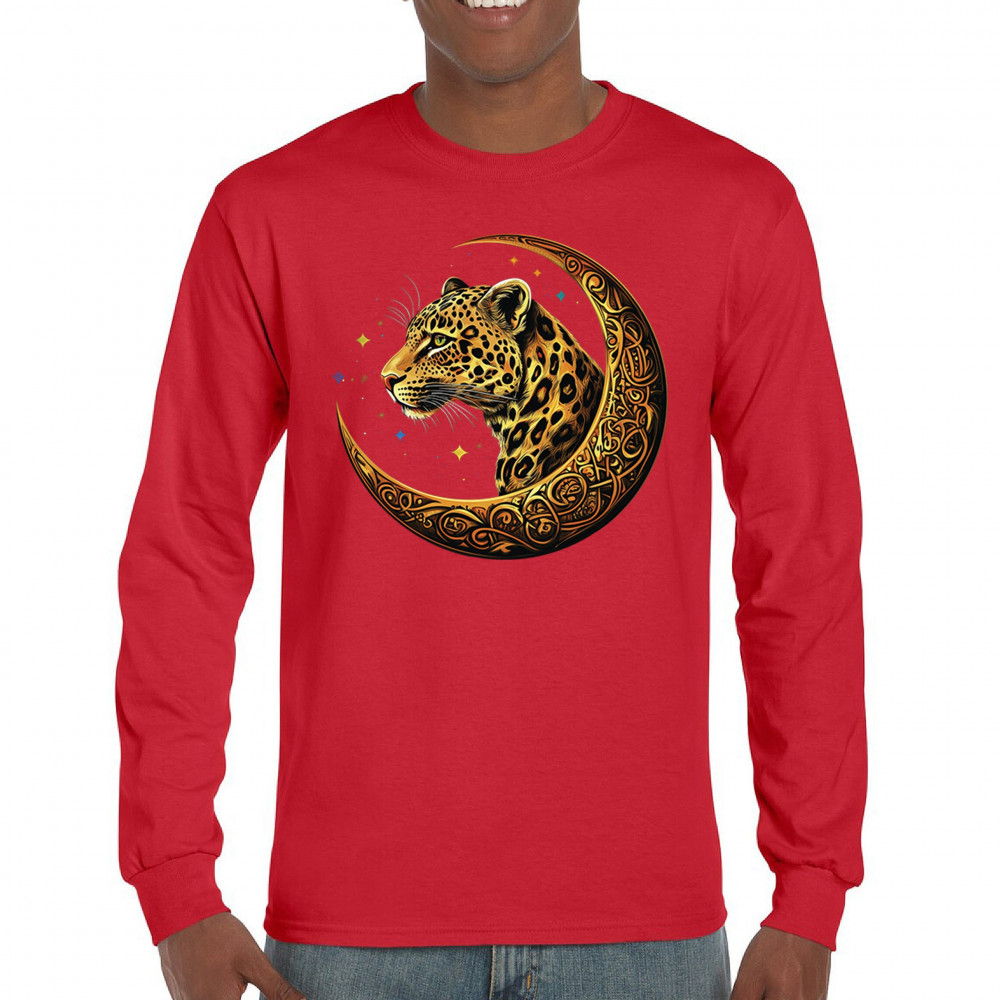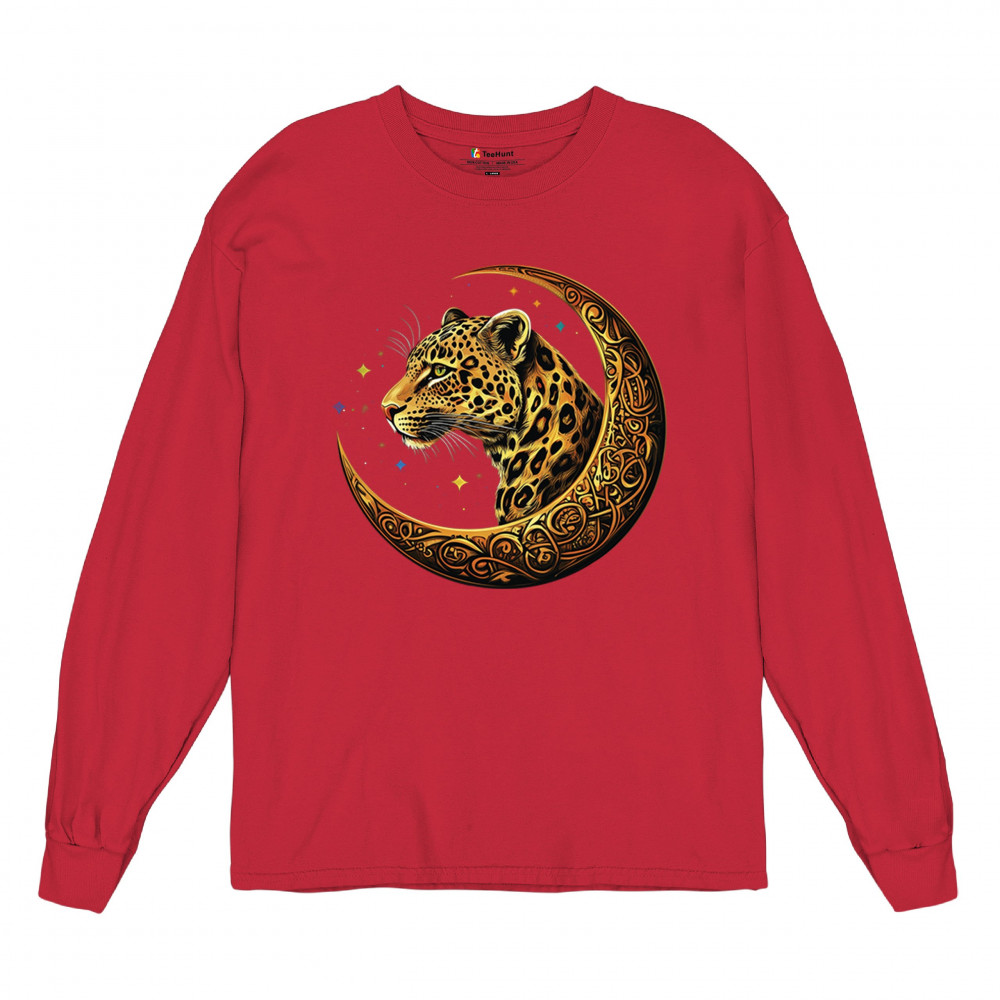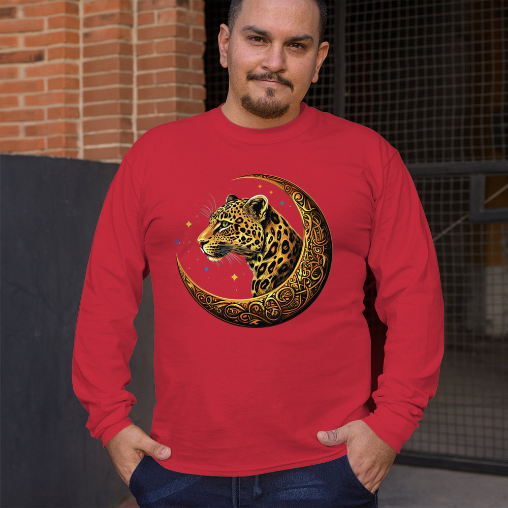 Unleash wild energy and spiritual symbolism with this bold leopard design set inside a golden Celtic crescent moon. A cosmic starry background amplifies its mystical vibe, symbolizing agility, independence, and awareness. Perfect for big cat lovers, jungle animal fans, and seekers of fantasy or tribal-inspired art.