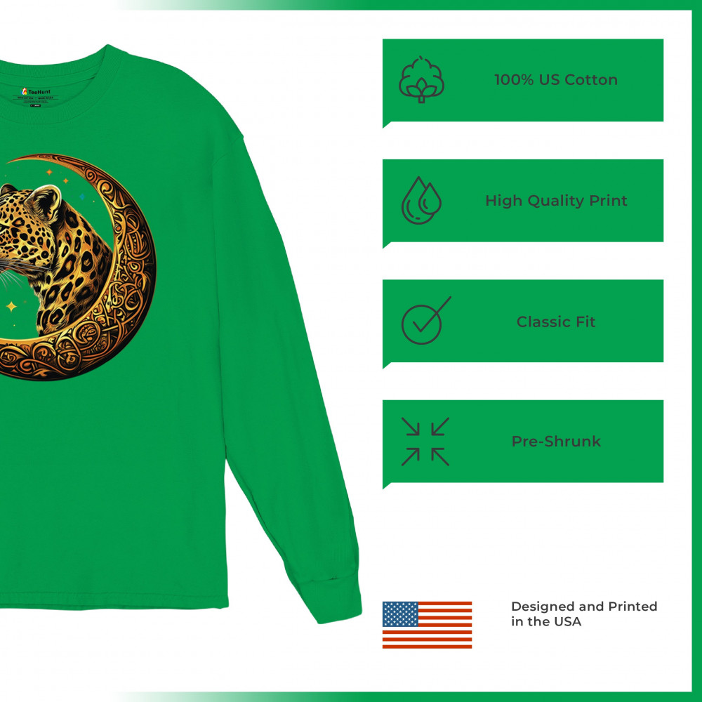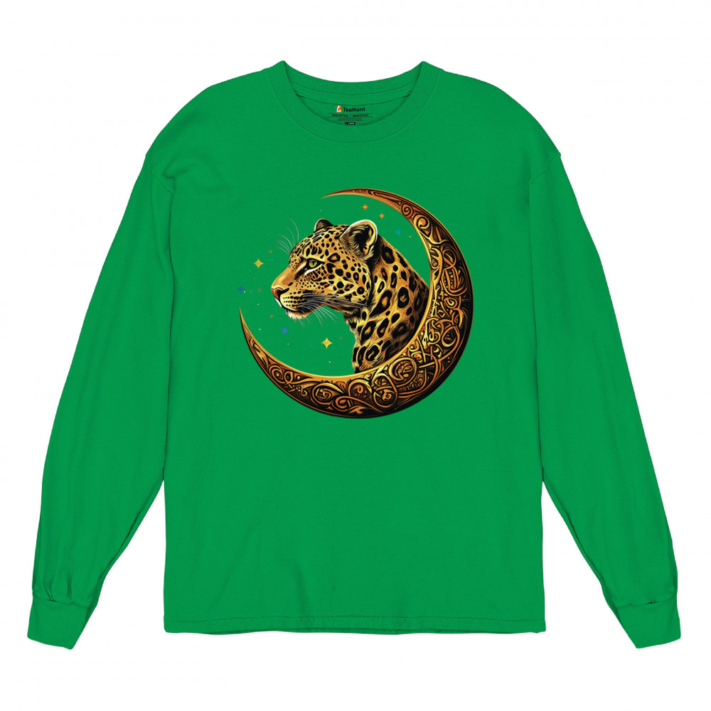 Unleash wild energy and spiritual symbolism with this bold leopard design set inside a golden Celtic crescent moon. A cosmic starry background amplifies its mystical vibe, symbolizing agility, independence, and awareness. Perfect for big cat lovers, jungle animal fans, and seekers of fantasy or tribal-inspired art.