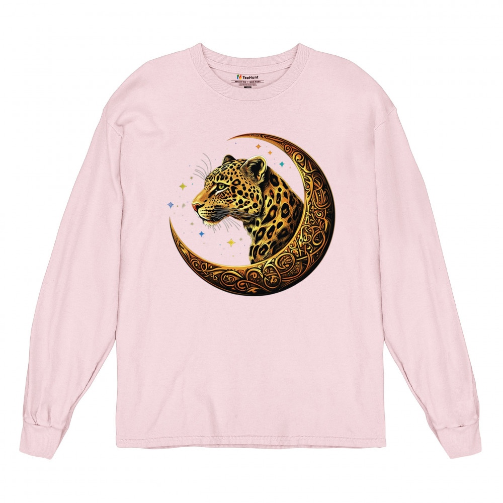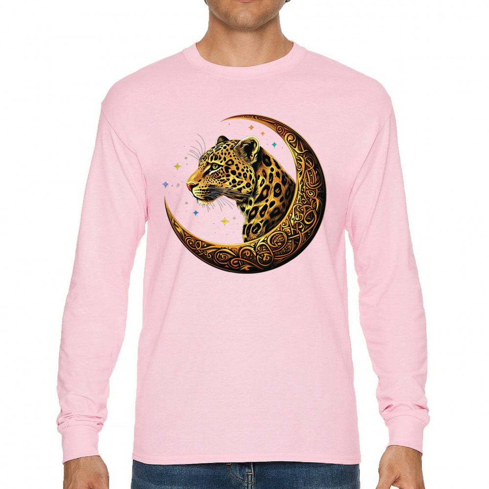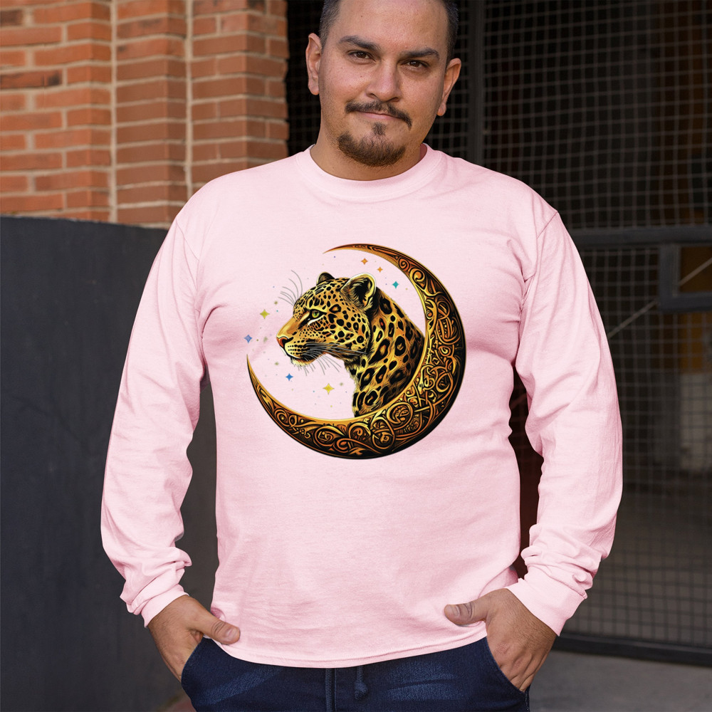 Unleash wild energy and spiritual symbolism with this bold leopard design set inside a golden Celtic crescent moon. A cosmic starry background amplifies its mystical vibe, symbolizing agility, independence, and awareness. Perfect for big cat lovers, jungle animal fans, and seekers of fantasy or tribal-inspired art.