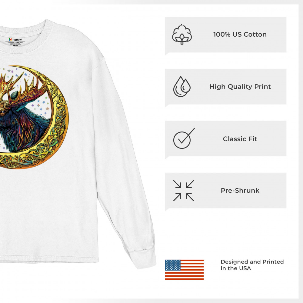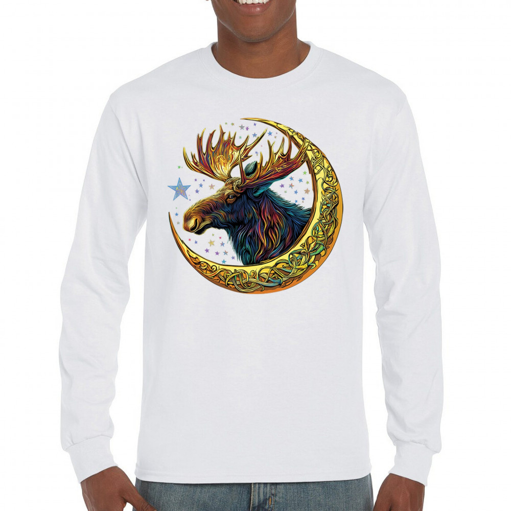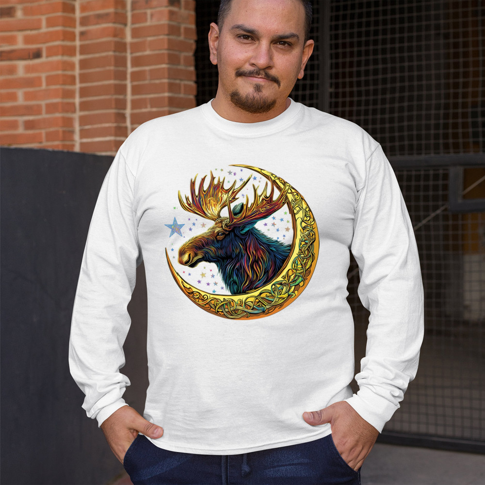 Mystical moose in gold Celtic crescent moon design—symbolizes strength, nature wisdom, and cosmic spirit for fantasy lovers and woodland fans.