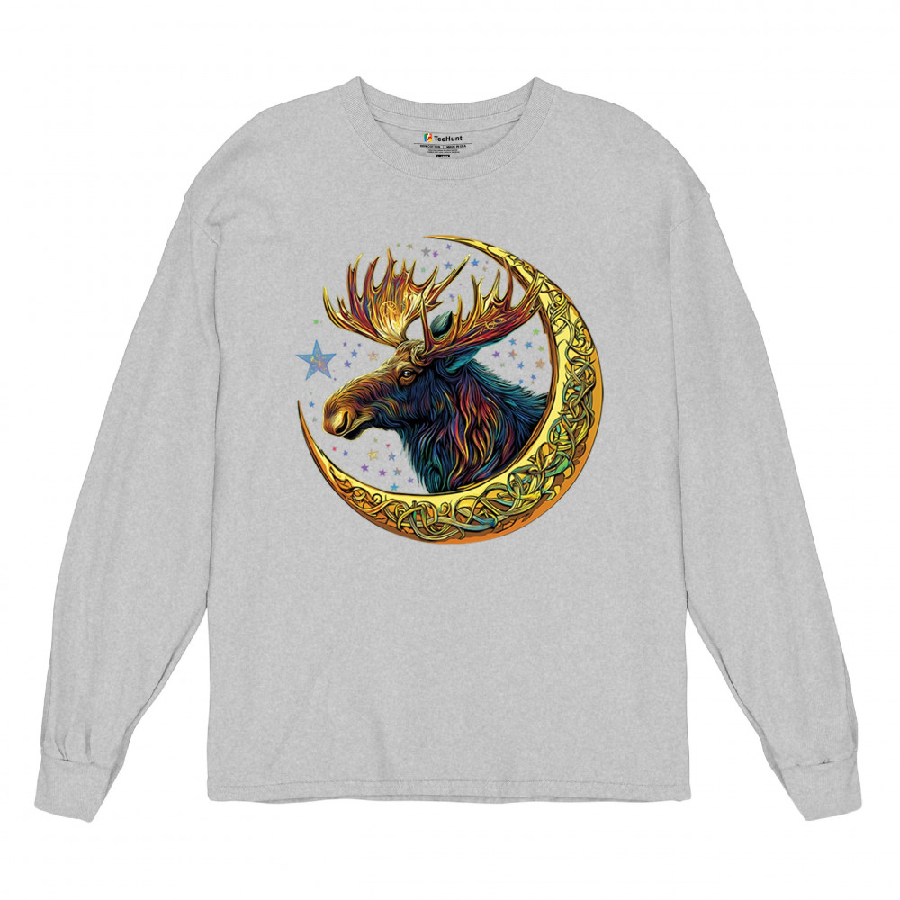 Mystical moose in gold Celtic crescent moon design—symbolizes strength, nature wisdom, and cosmic spirit for fantasy lovers and woodland fans.